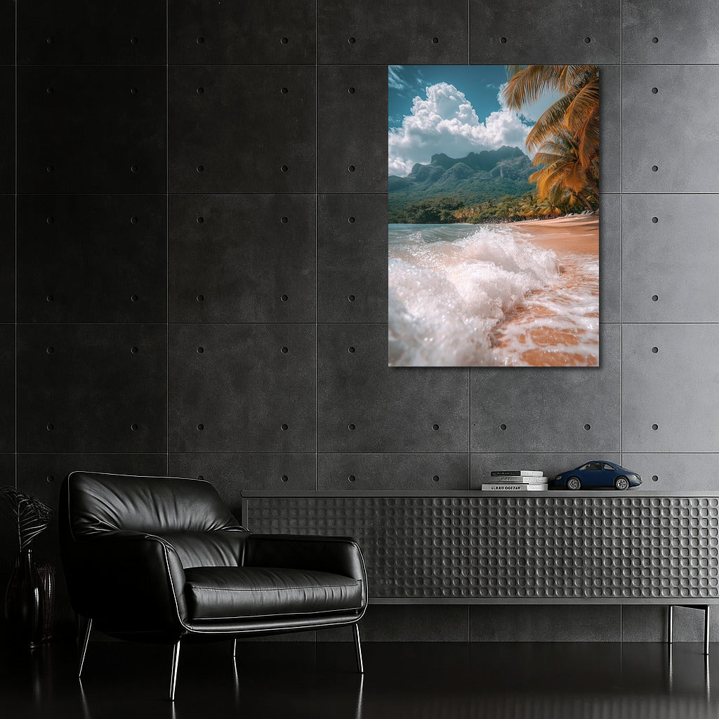 Tropical bliss comes to life in this painting! Waves, palm trees and mountains create the perfect poster for your space. See more from the collection: Beaches, Oceans & Coastal Views Art