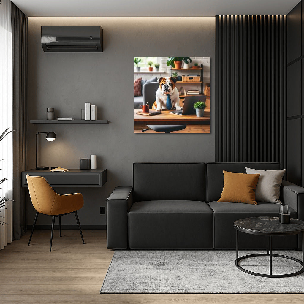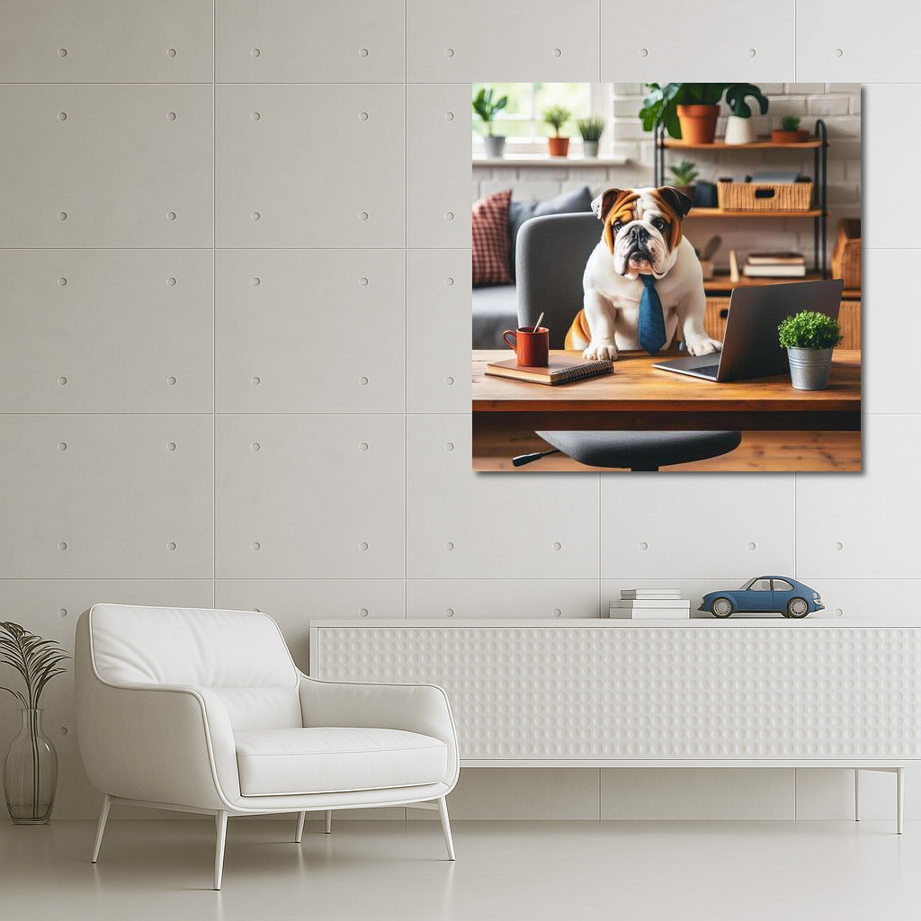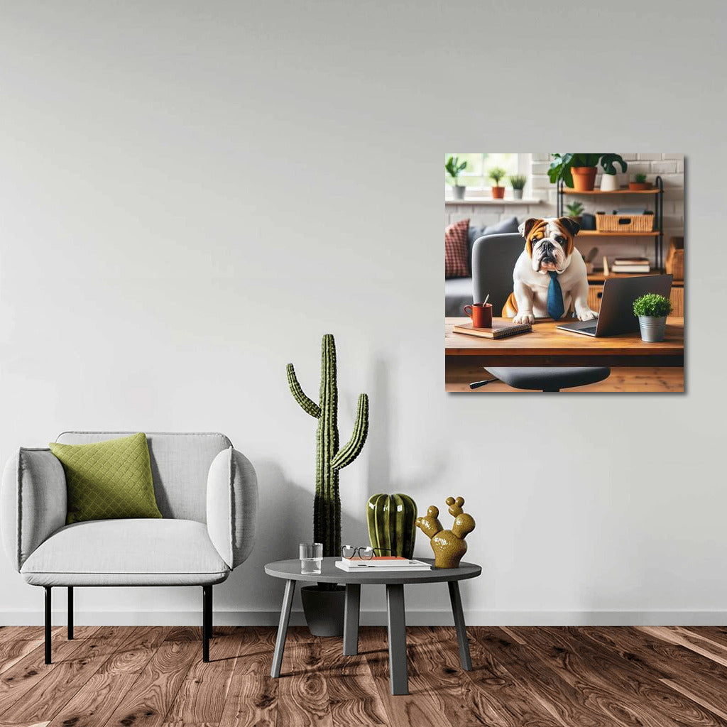 Poster Bulldog in the Office 2 - fun wall art with an English Bulldog in a business style. Perfect for livening up the interior! See more from the collection: Animals Art