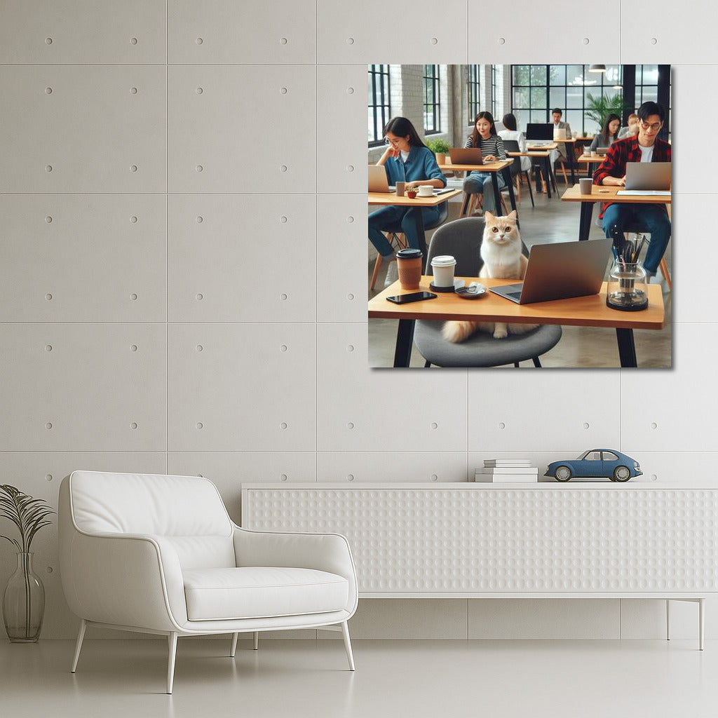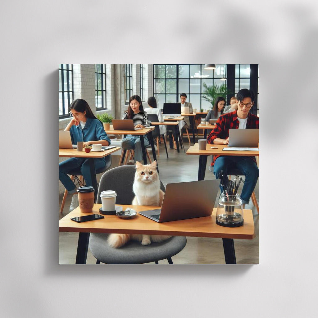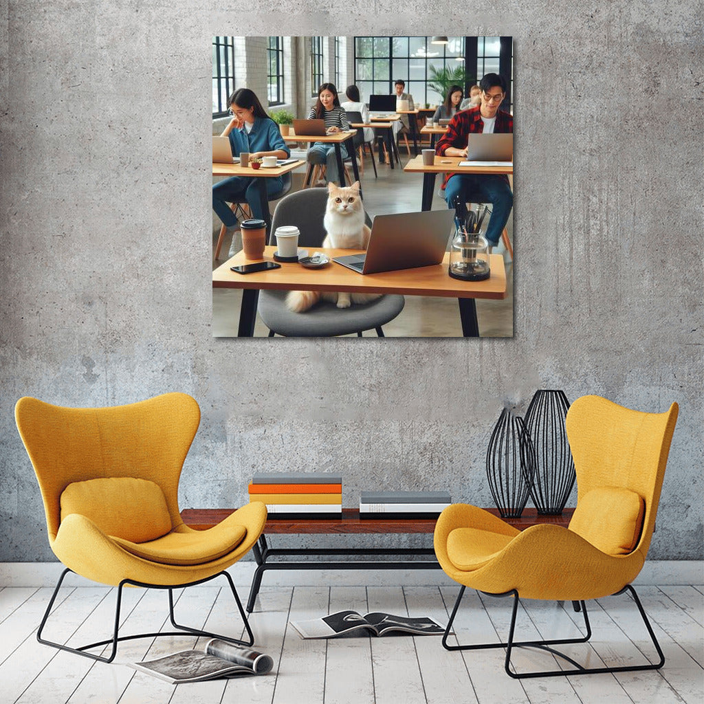Cat and people in the office, creating harmony of work and comfort. The perfect poster for comfort and inspiration in the office space. See more from the collection: Animals Art