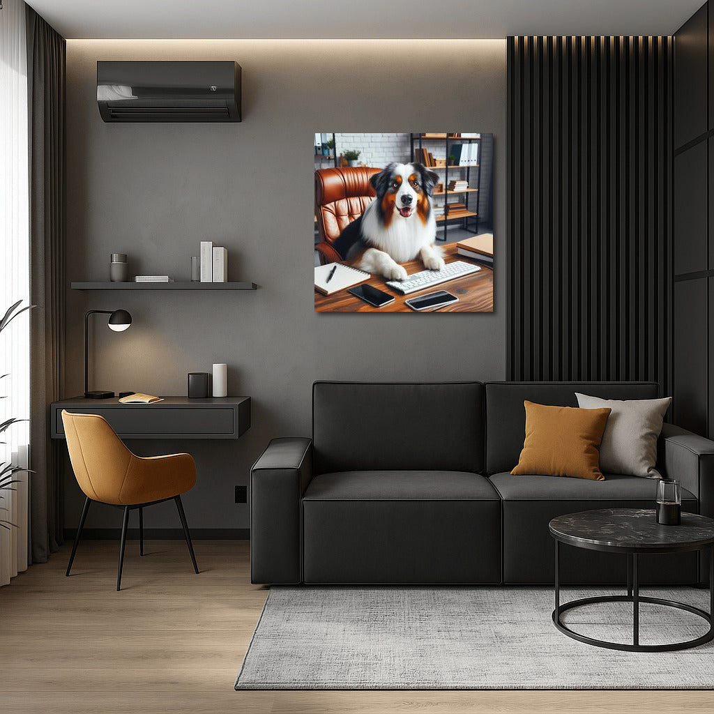 Australian Shepherd at work in the office - add humor and style to your wall art with this funny poster. See more from the collection: Animals Art