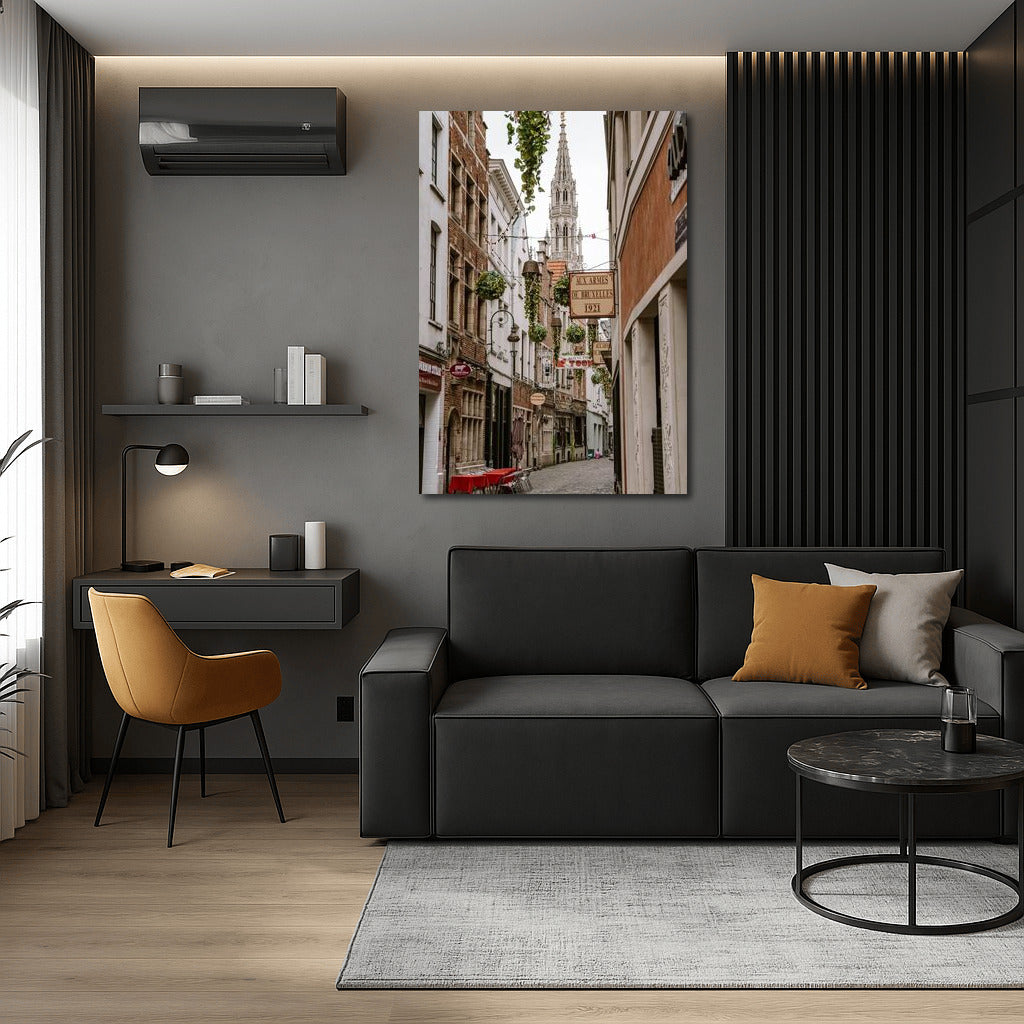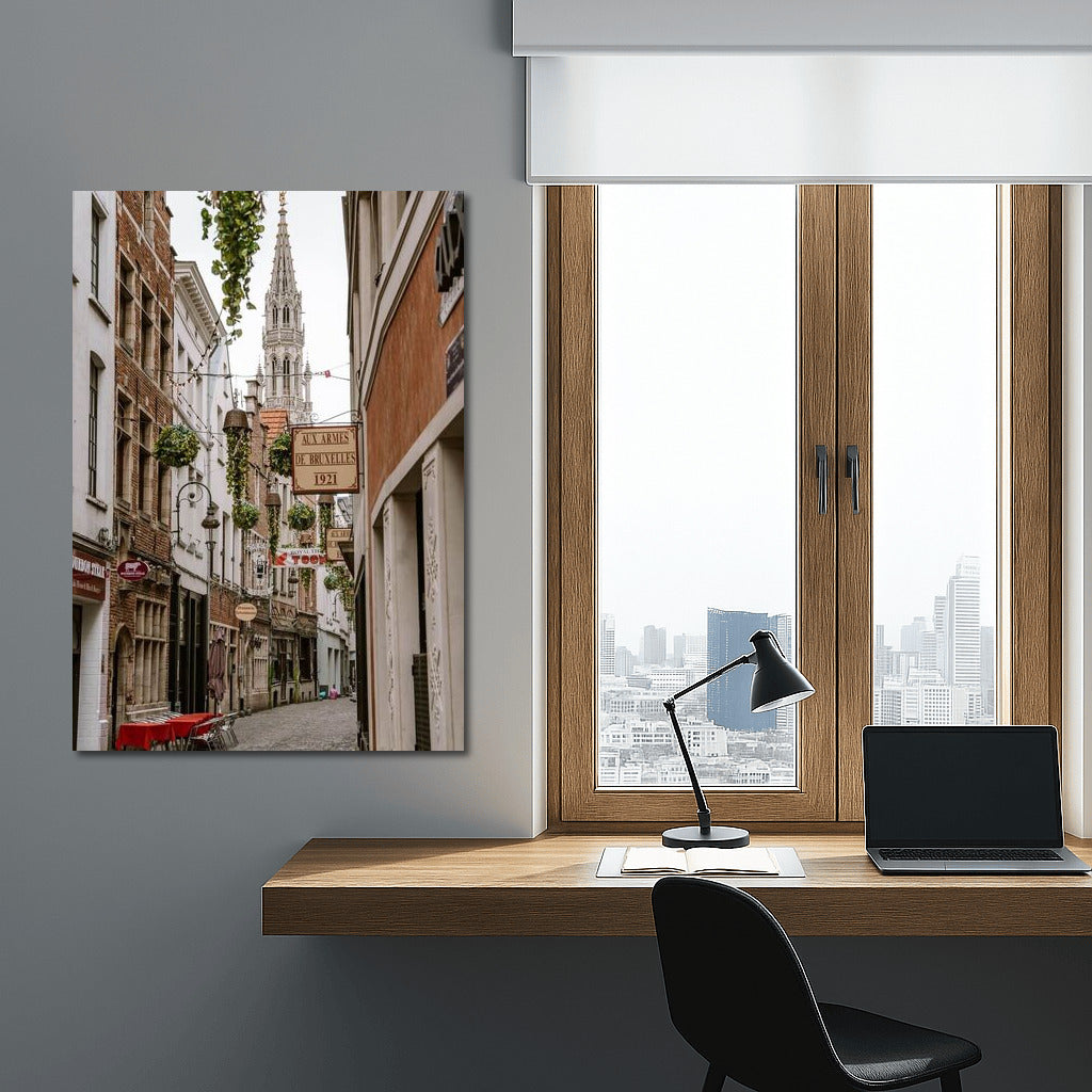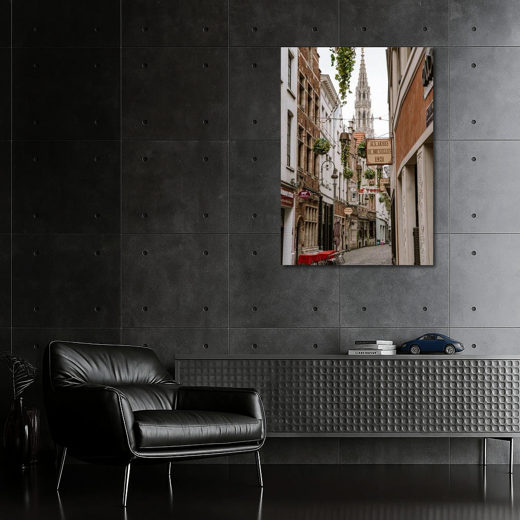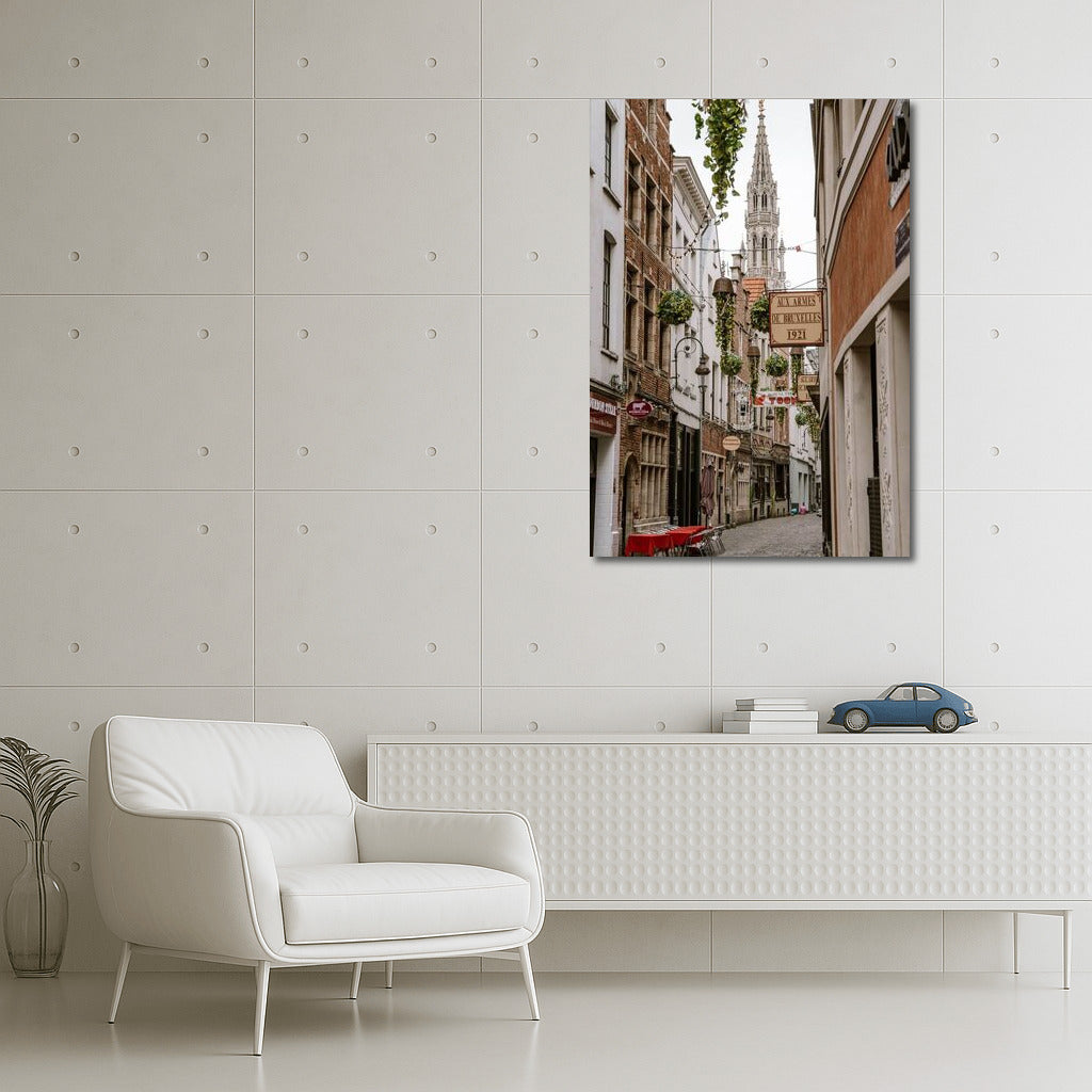 Belgian charm in every detail: an old street leading to a majestic tower. Add a touch of European fairy tale to your home. See more from the collection: Belgium Art