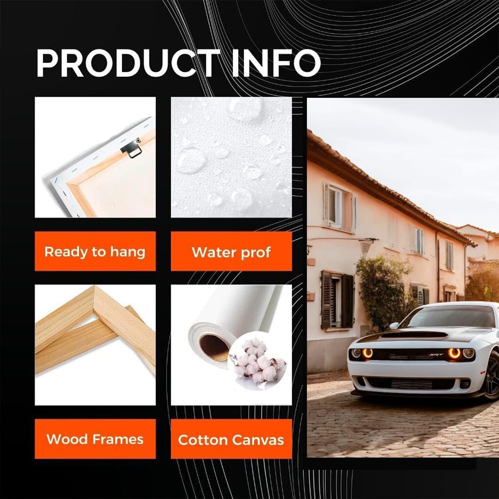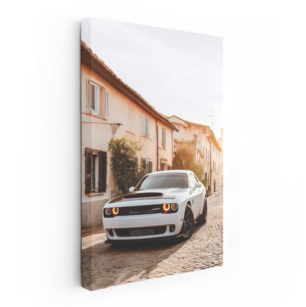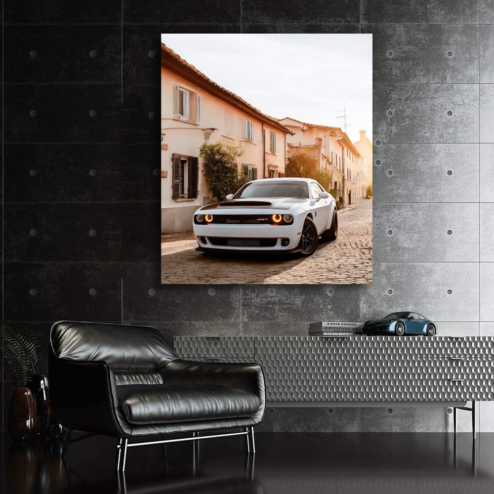 This poster is pure joy for anyone who is a fan of old school cars. Dodge against the backdrop of an old city, stylish and bold. Wall art that screams power and speed. A painting that will become the center of attention in any garage collection. See more from the collection: Dodge Art