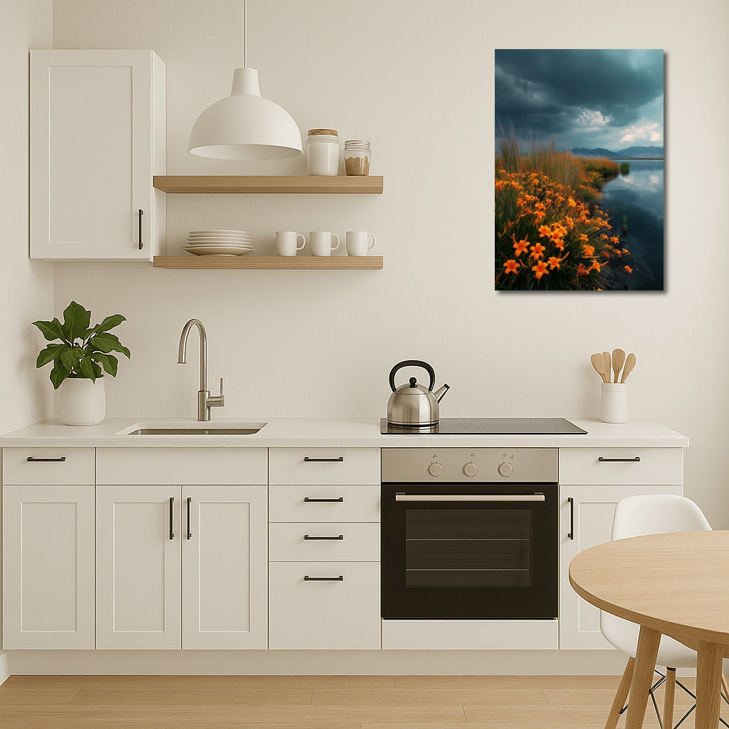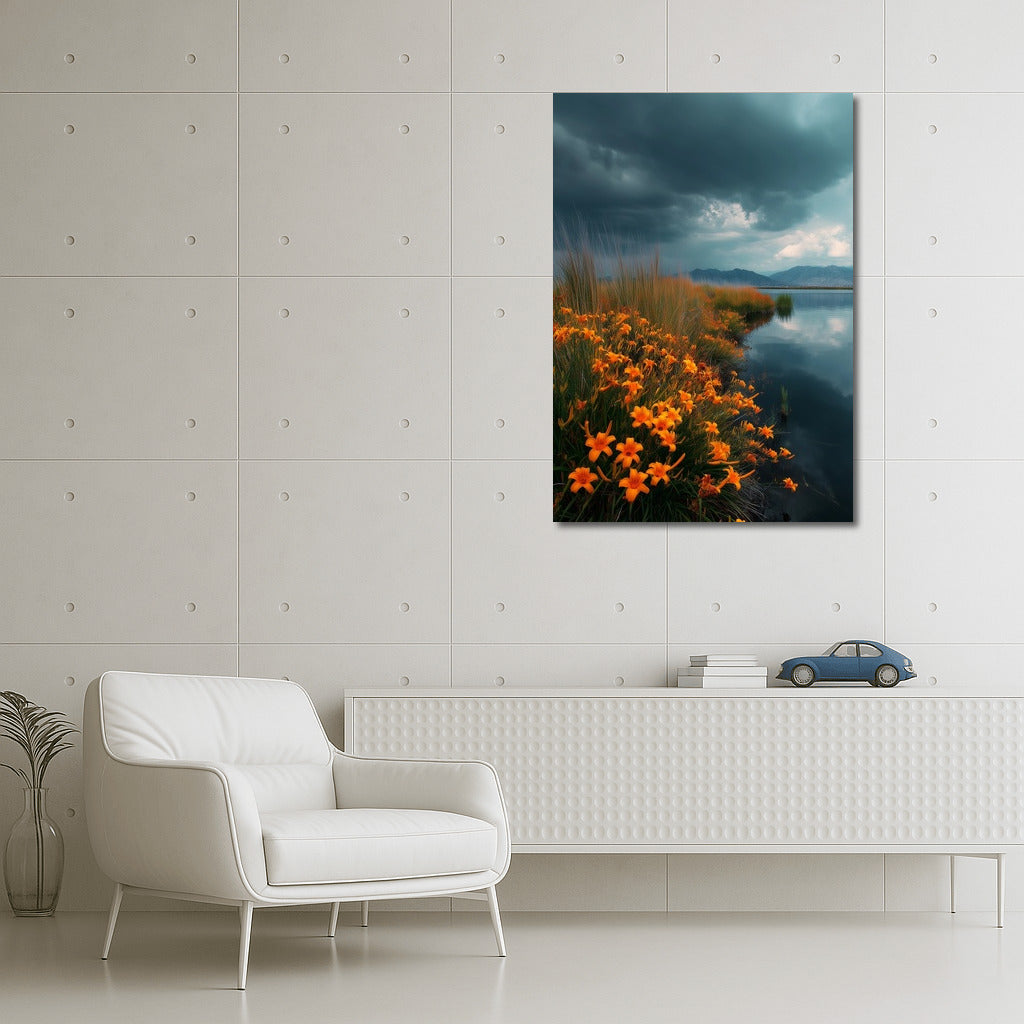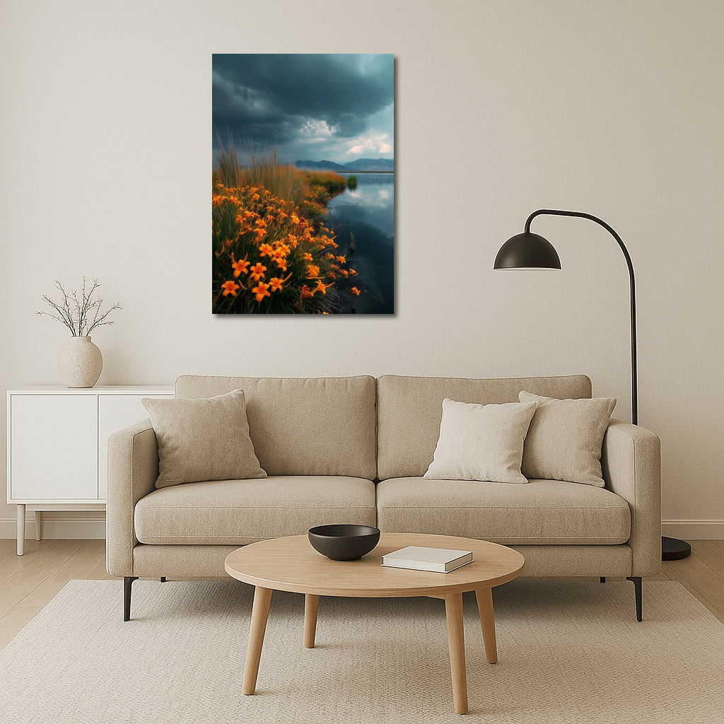 Orange lilies bring this wall art to life, creating a vibrant contrast with the dramatic sky and water reflections. See more from the collection: Flowers Art