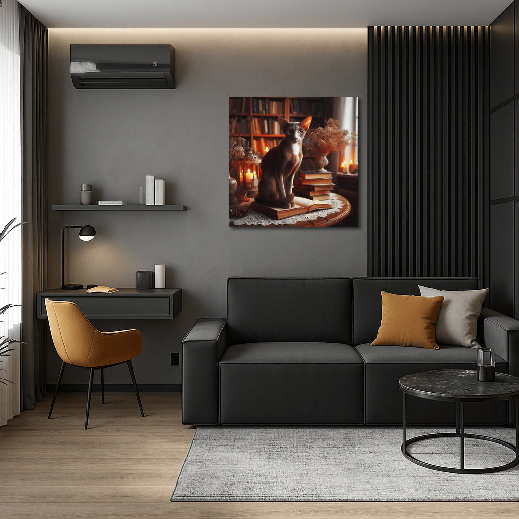 Charming Oriental Shorthair in a cozy library. Wall art to create an atmosphere of warmth and coziness in your home. See more from the collection: Animals Art