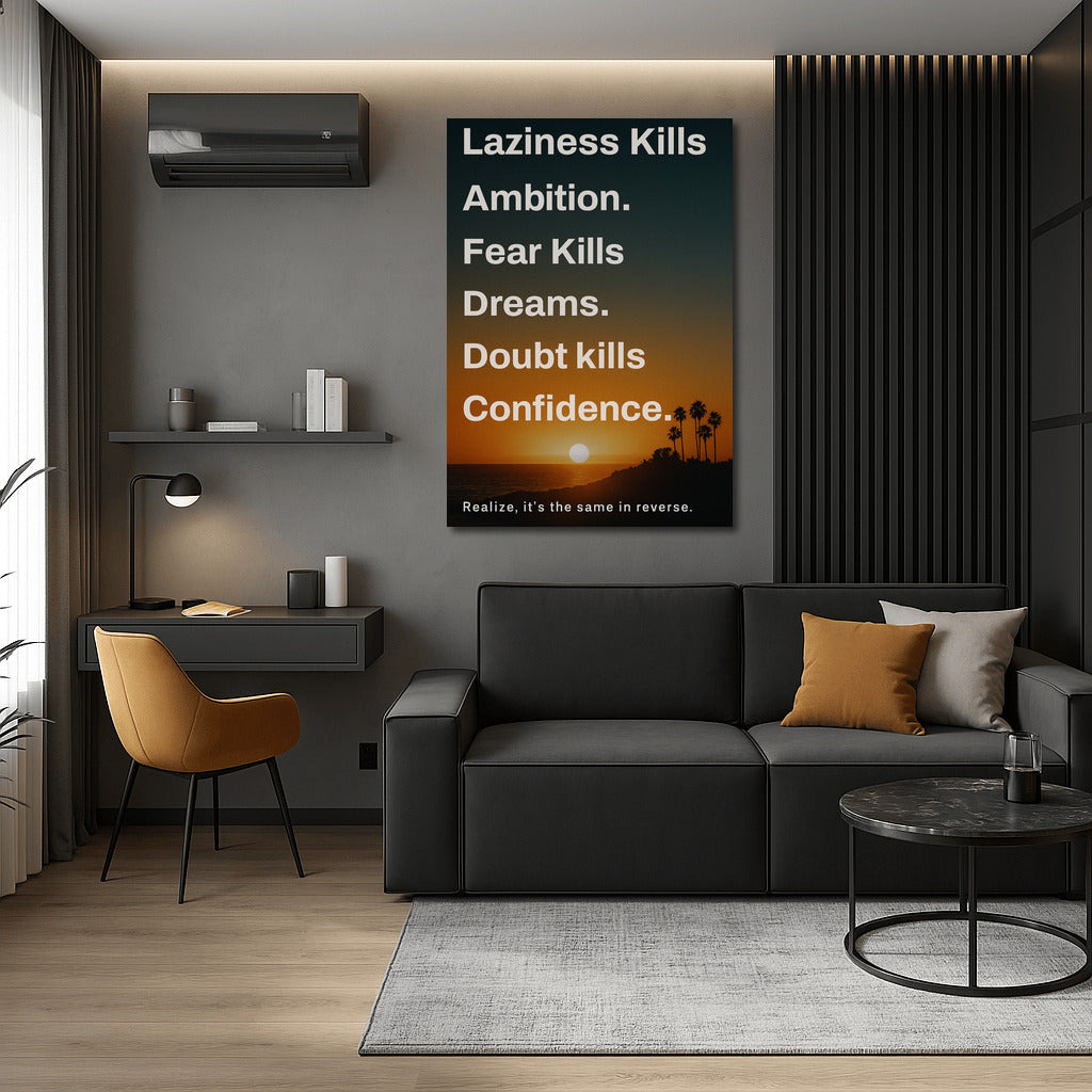 Motivational wall art: Laziness Kills Ambition. Fear Kills Dreams. Doubt kills Confidence. Realize, everything is reversible. See more from the collection: Inspirational & Motivational Quotes Art