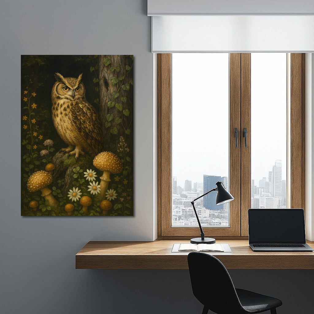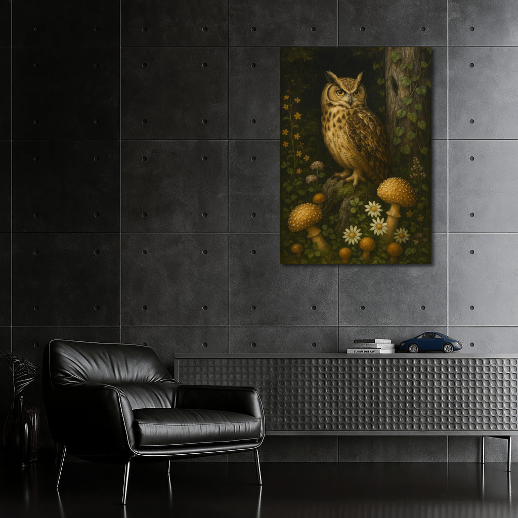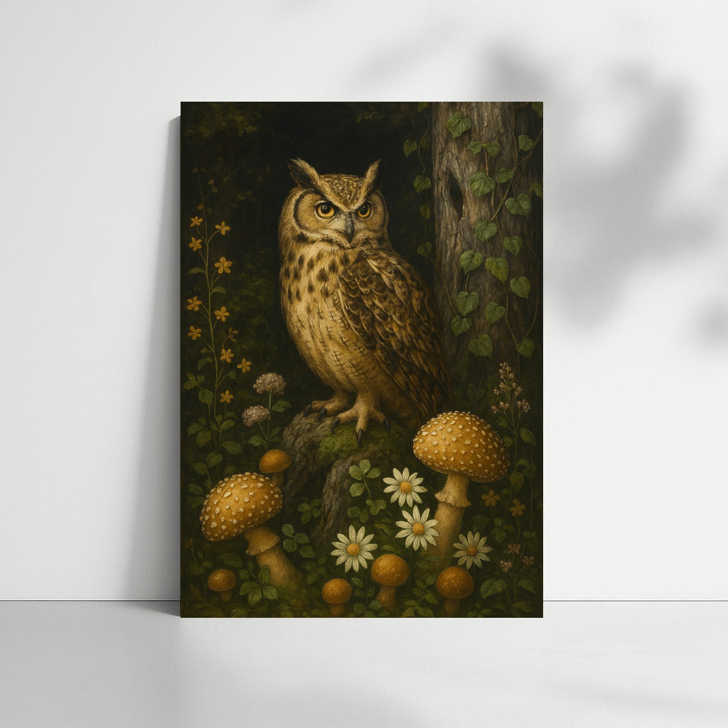 A mysterious painting in the Dark Academia style: an owl among forest mushrooms and flowers, will fill your interior with an atmosphere of mystery and wisdom. See more from the collection: Dark Academia Art