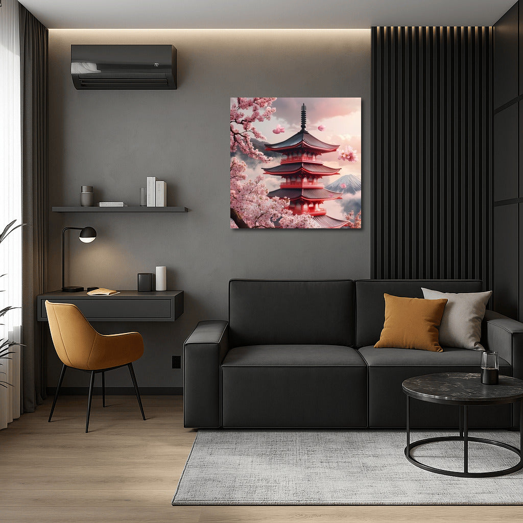 Spring inspiration: an elegant pagoda among blossoming sakura. The painting will enliven your interior with oriental charm and tranquility. See more from the collection: Mixed Wall Art