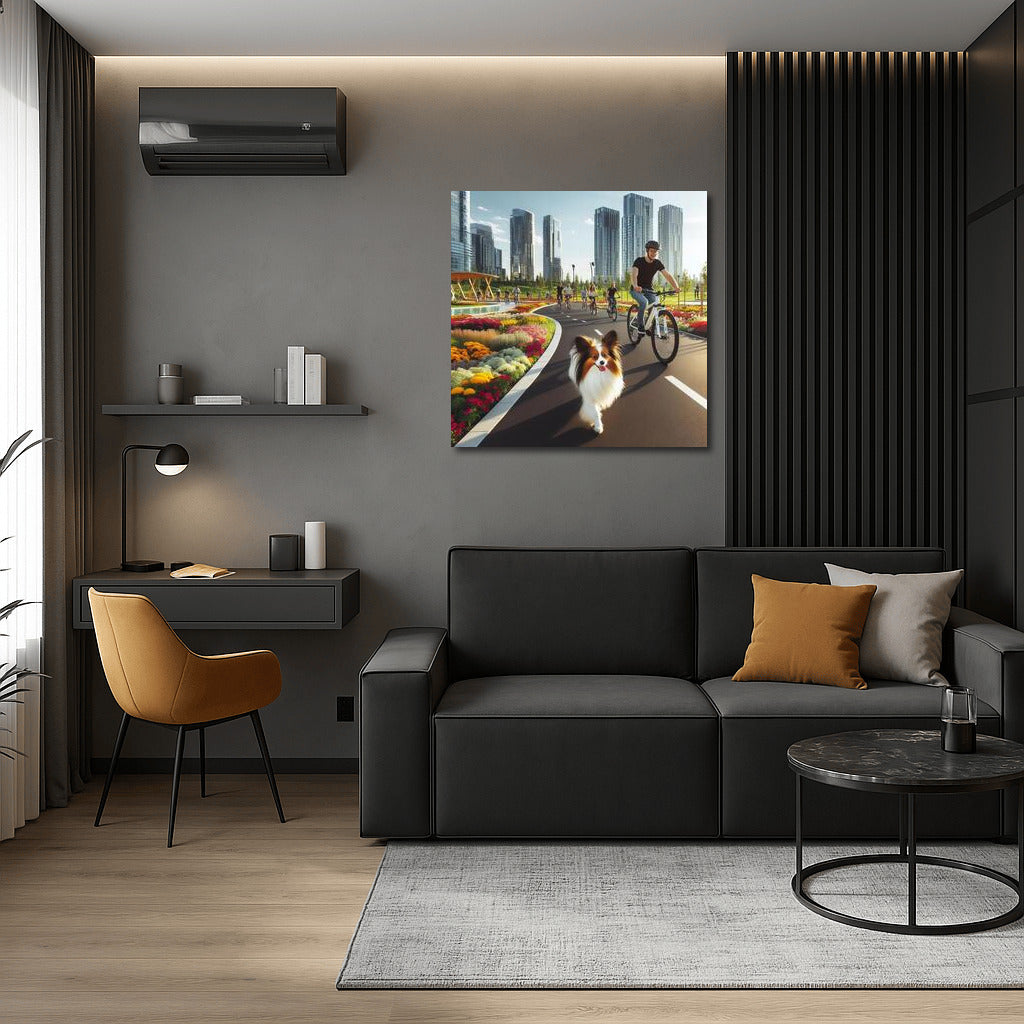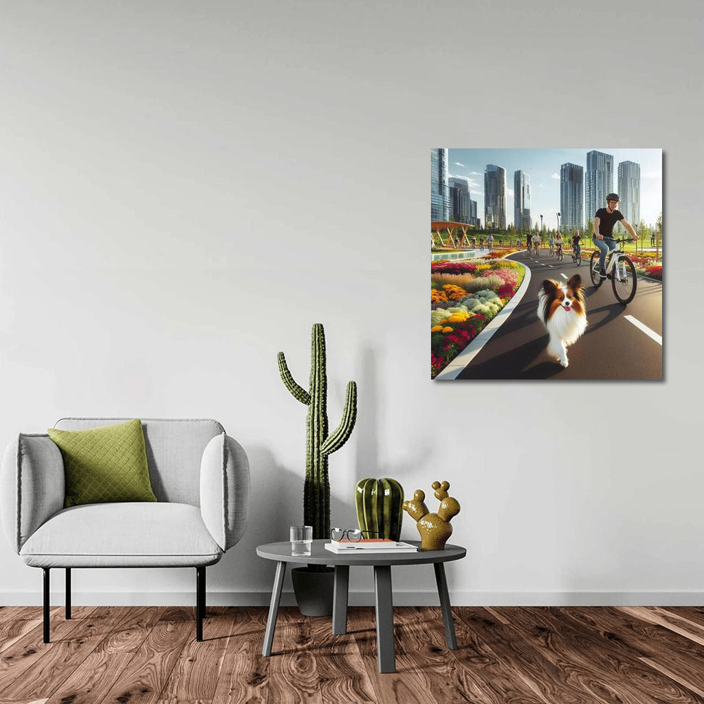 Vibrant poster of a Papillon dog on a bike ride through a blooming city. Unique wall art for nature and movement lovers! See more from the collection: Animals Art