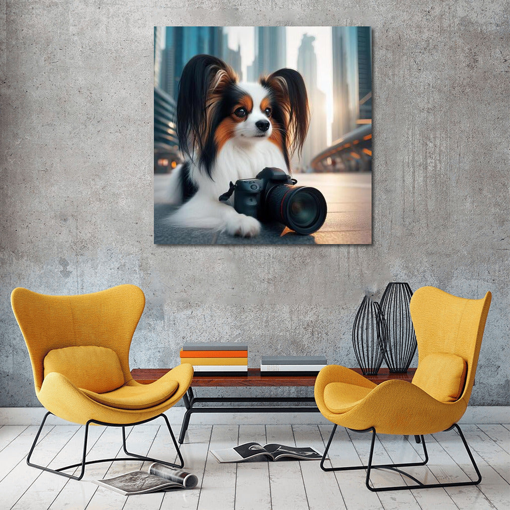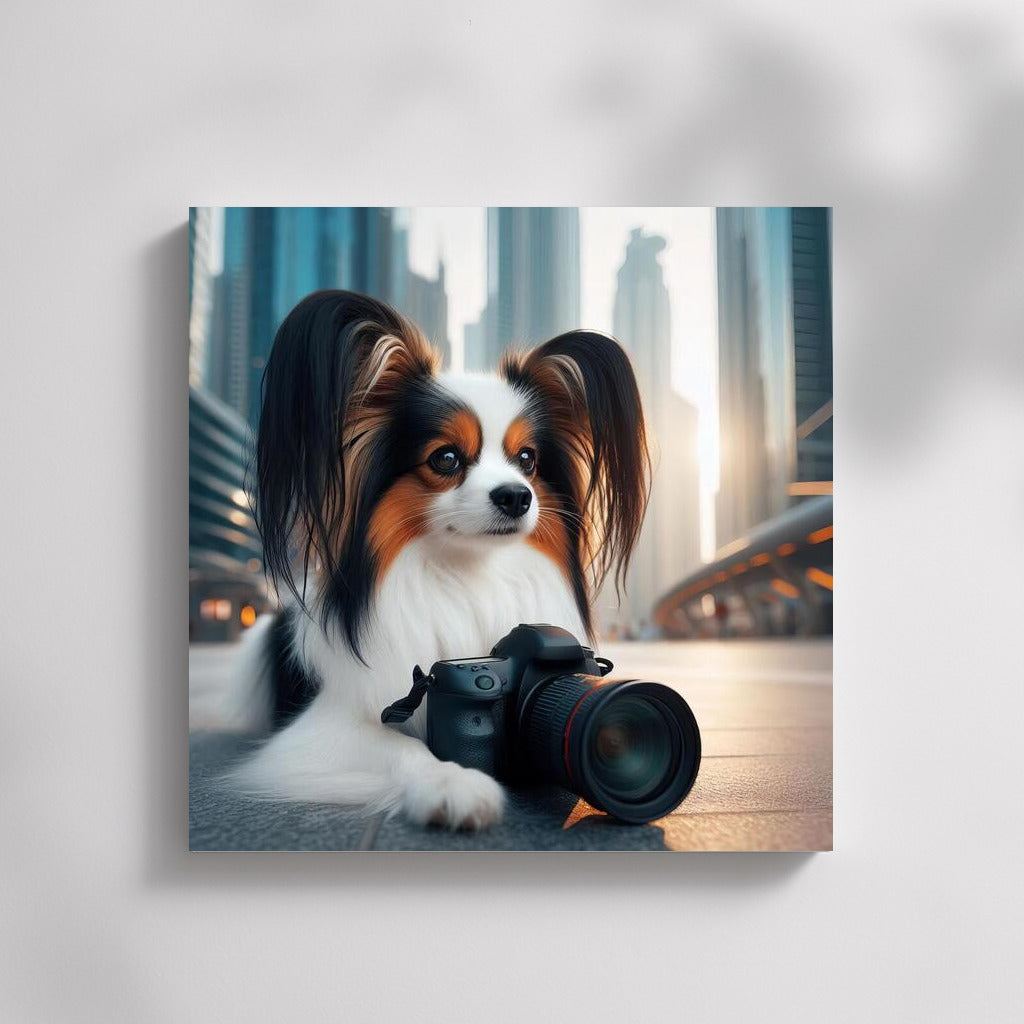 Virtual world of the future: papillon with a camera in a metropolis. The perfect poster for lovers of non-standard wall art. See more from the collection: Dogs Art