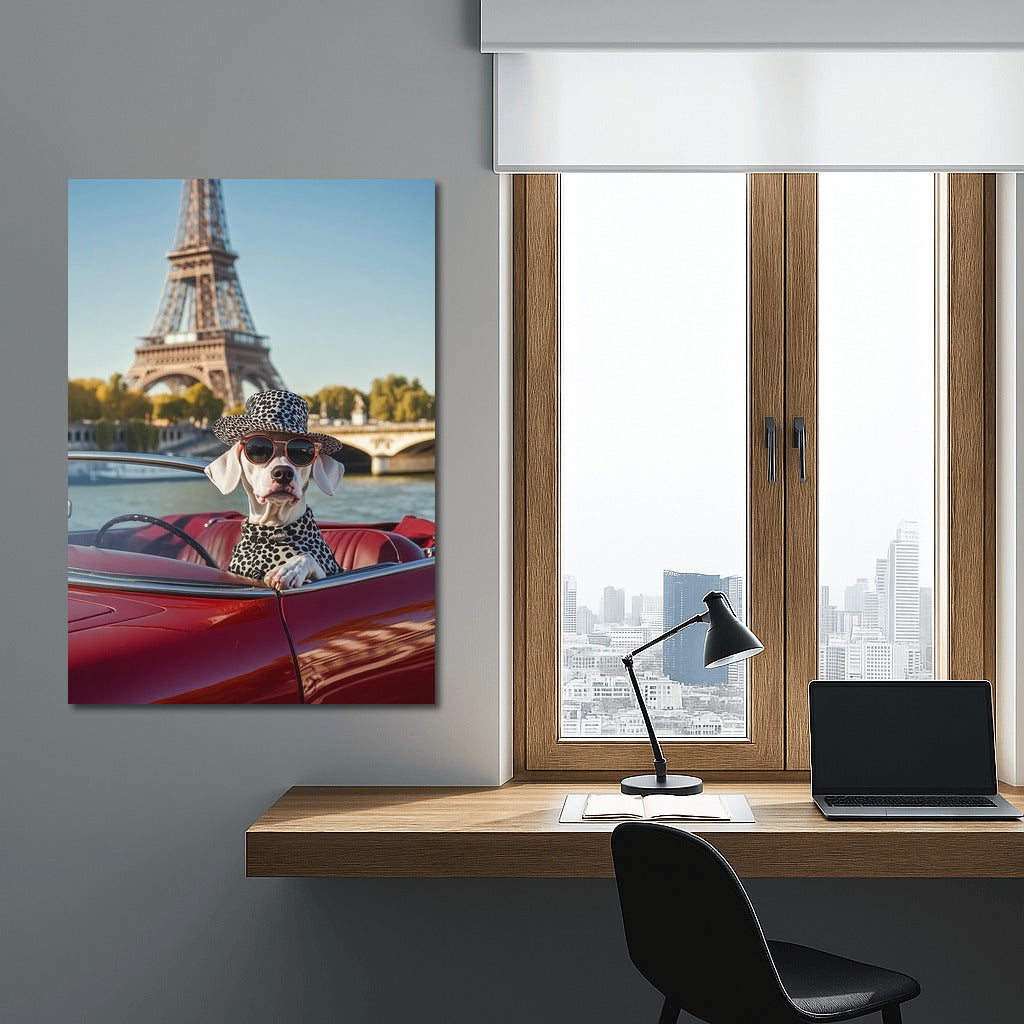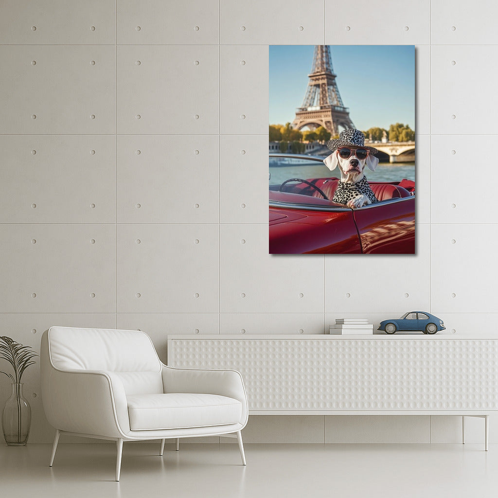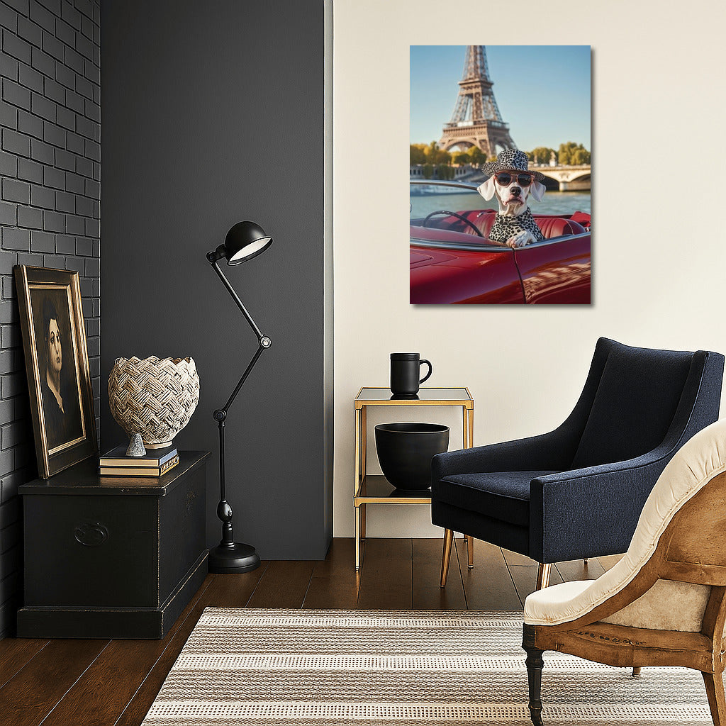 Poster: Stylish dog driving a retro car with the Eiffel Tower in the background. Wall art with chic and humor. See more from the collection: Animals Art