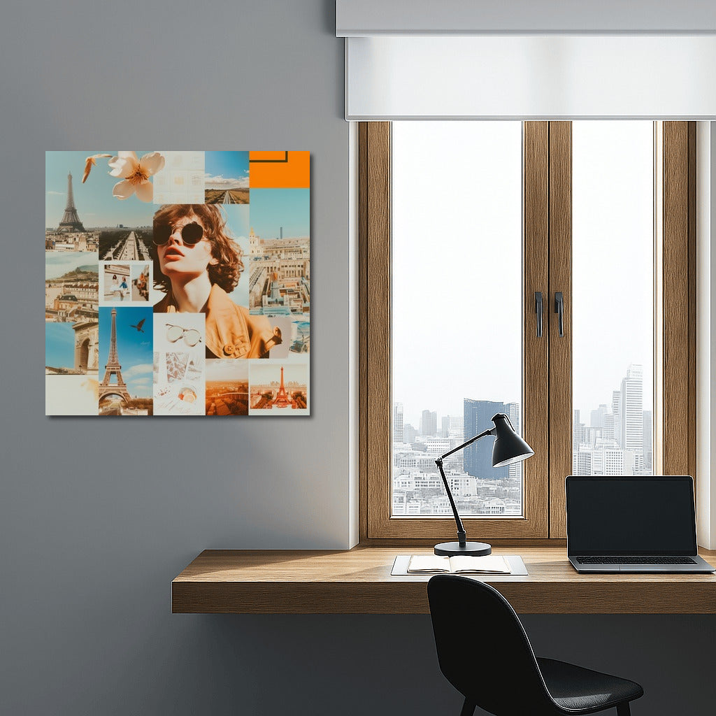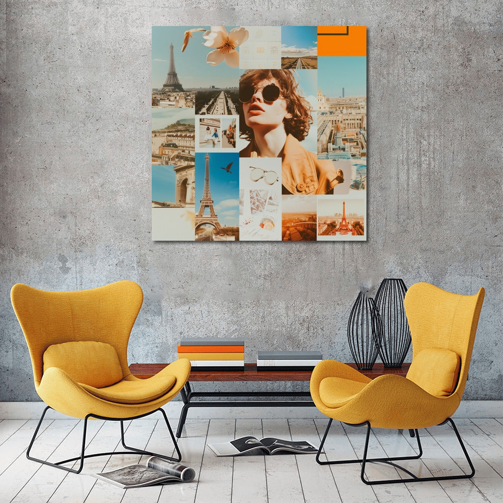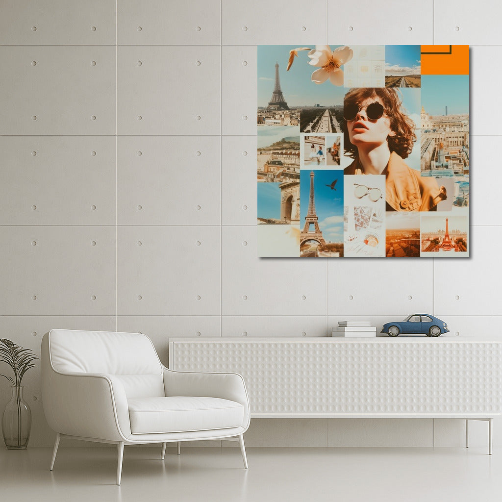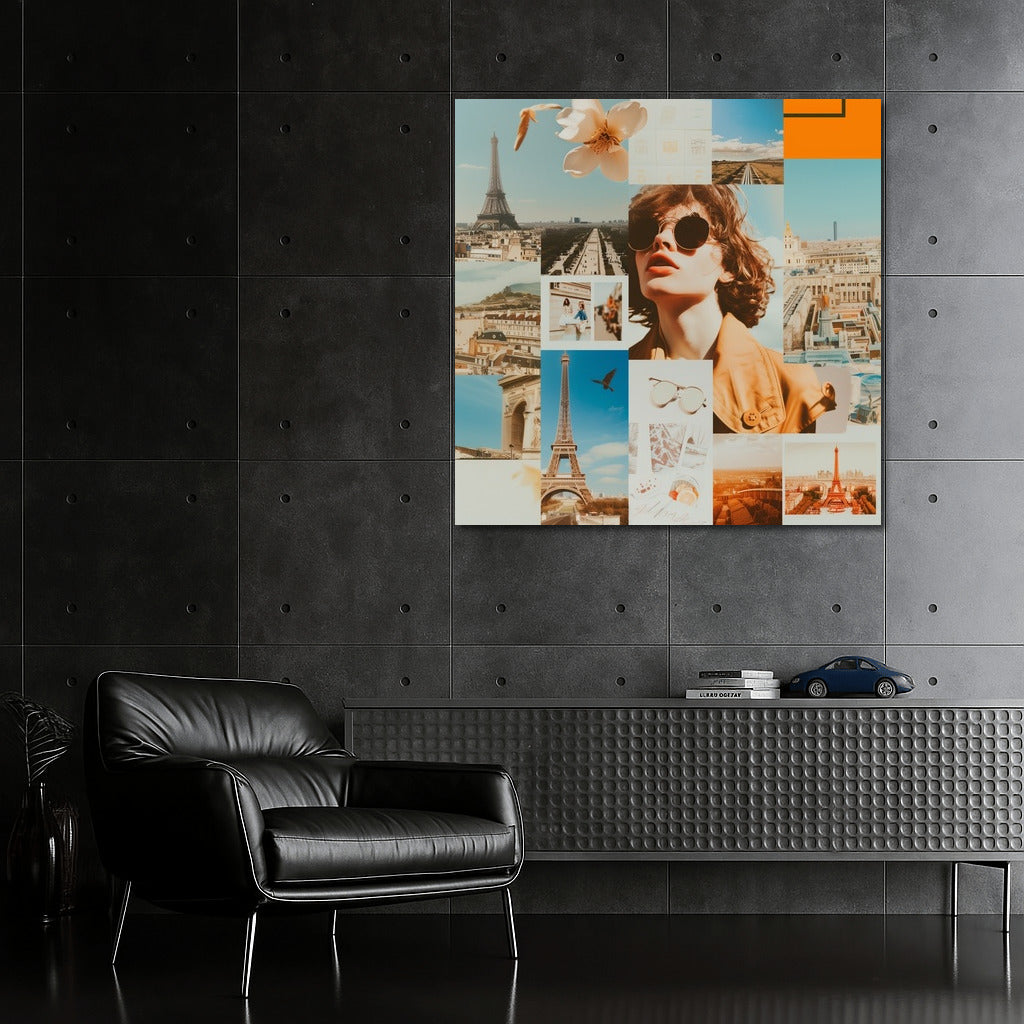 Modern poster: girl in glasses against the backdrop of Paris and the Eiffel Tower. Stylish wall art with an atmosphere of travel and dreams. See more from the collection: Cityscapes & Skylines Art