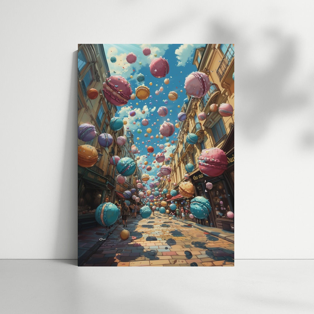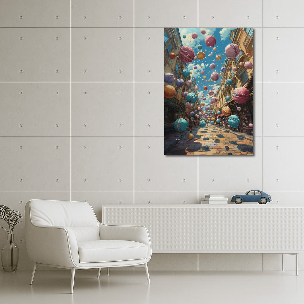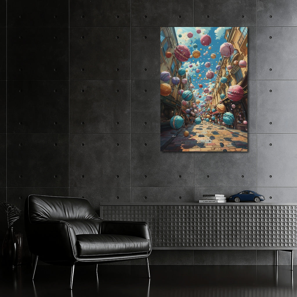 Dream poster: heavenly macaroni rain over a cozy street. Vibrant wall art that adds sweetness to every day! See more from the collection: Mixed Wall Art