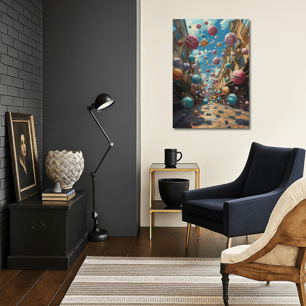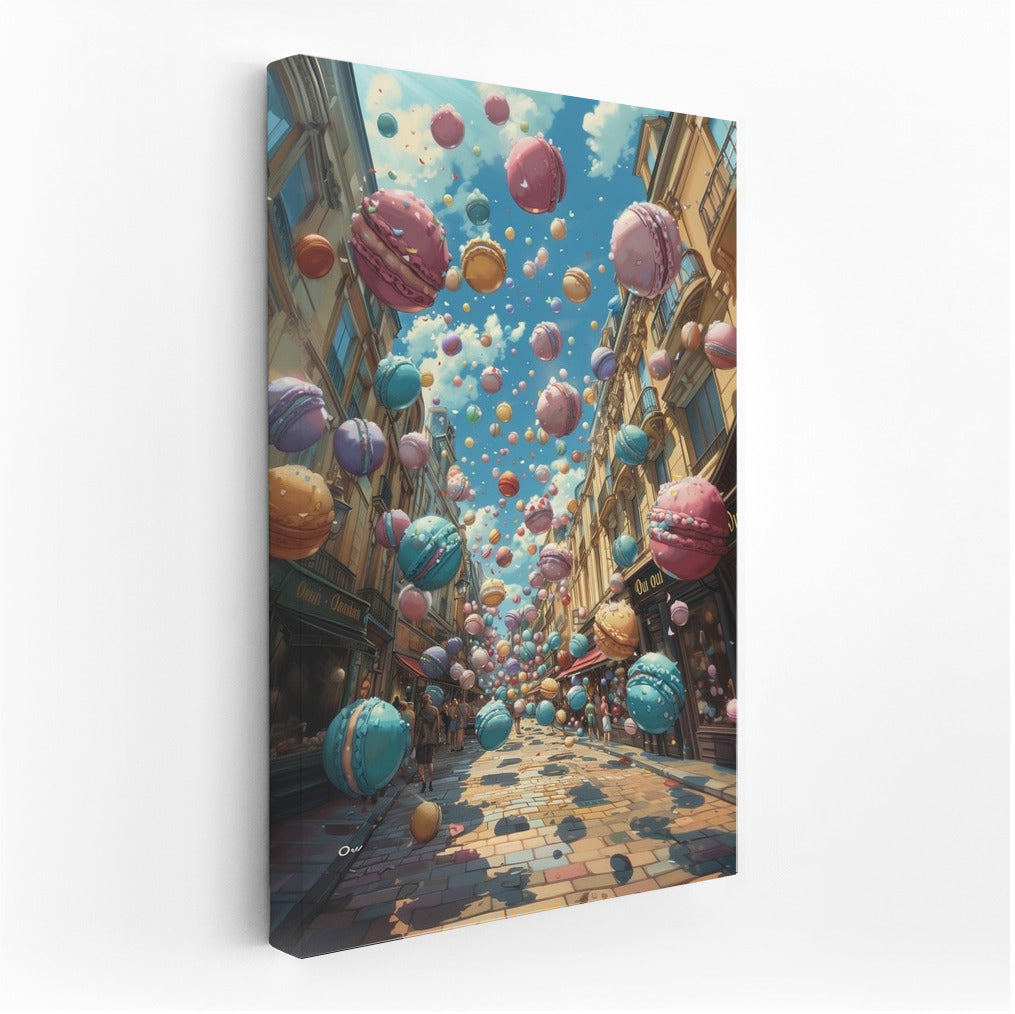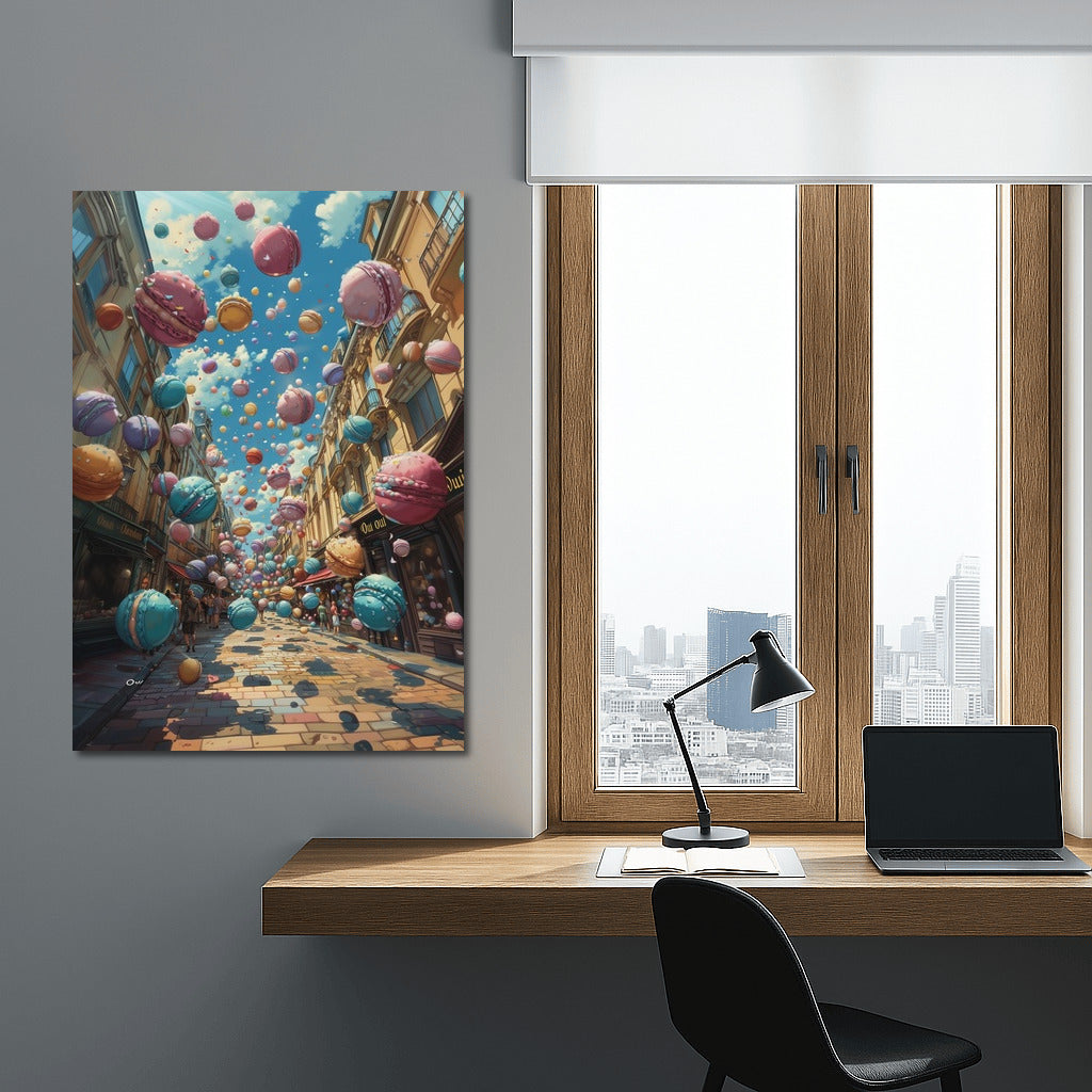 Dream poster: heavenly macaroni rain over a cozy street. Vibrant wall art that adds sweetness to every day! See more from the collection: Mixed Wall Art