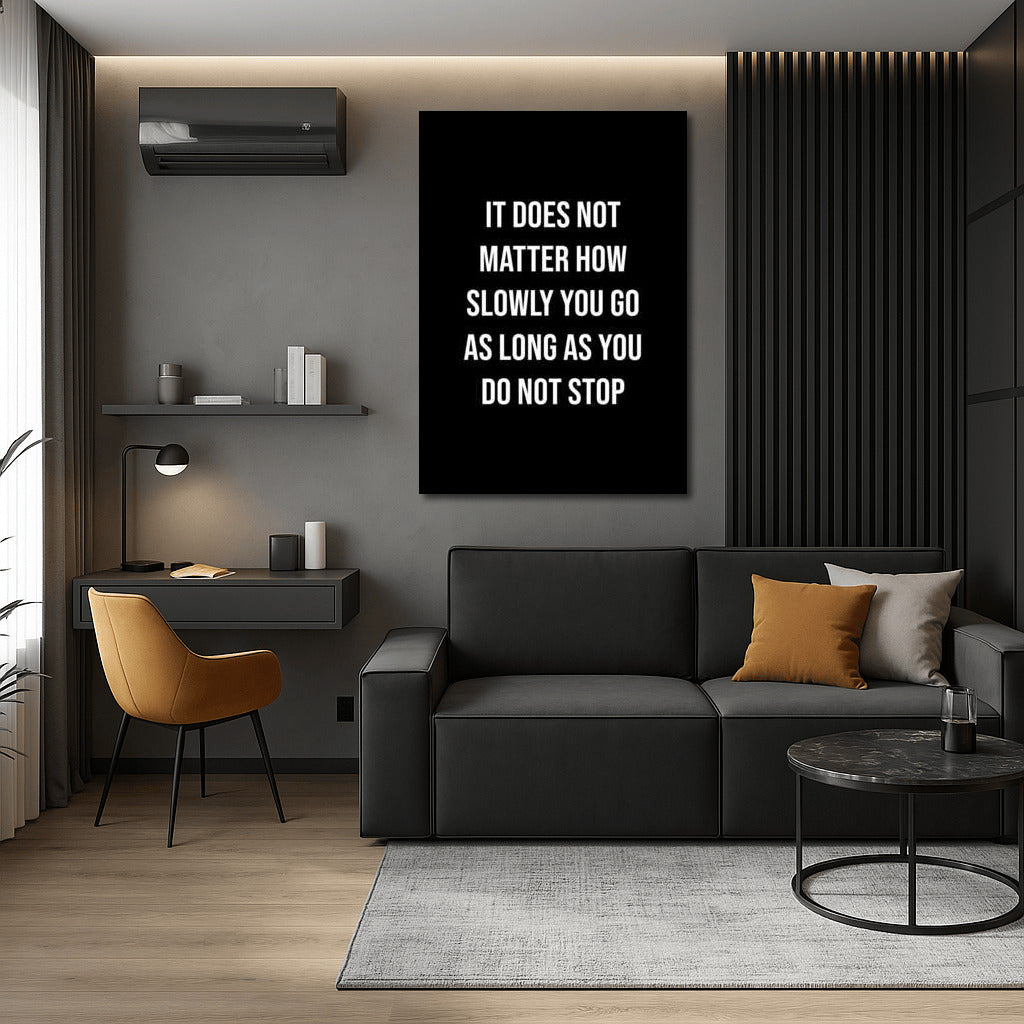 This inspirational quote poster It does not matter how slowly you go as long as you do not stop is the perfect wall art for daily motivation. See more from the collection: Inspirational & Motivational Quotes Art
