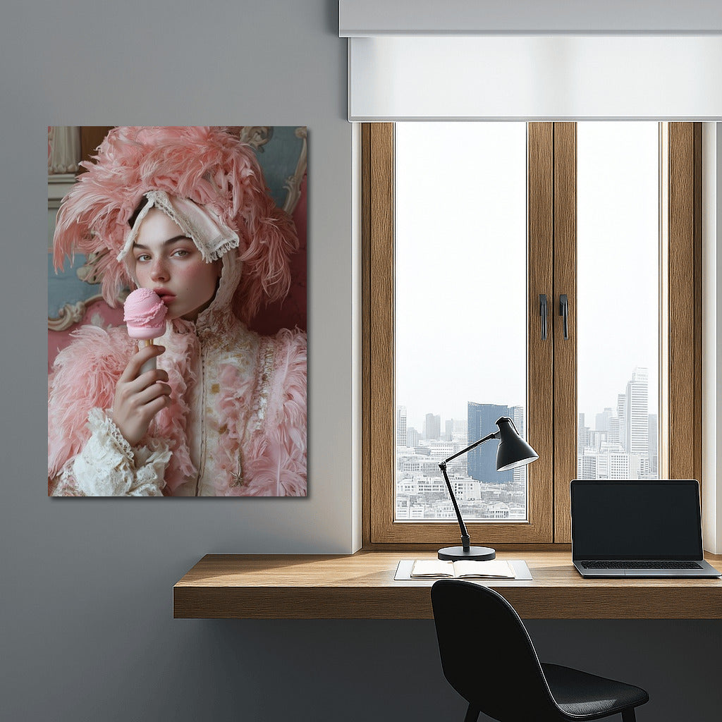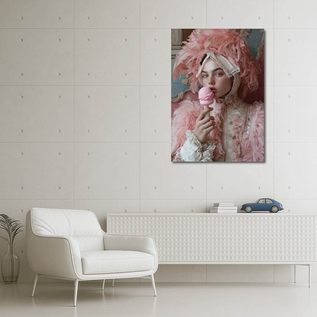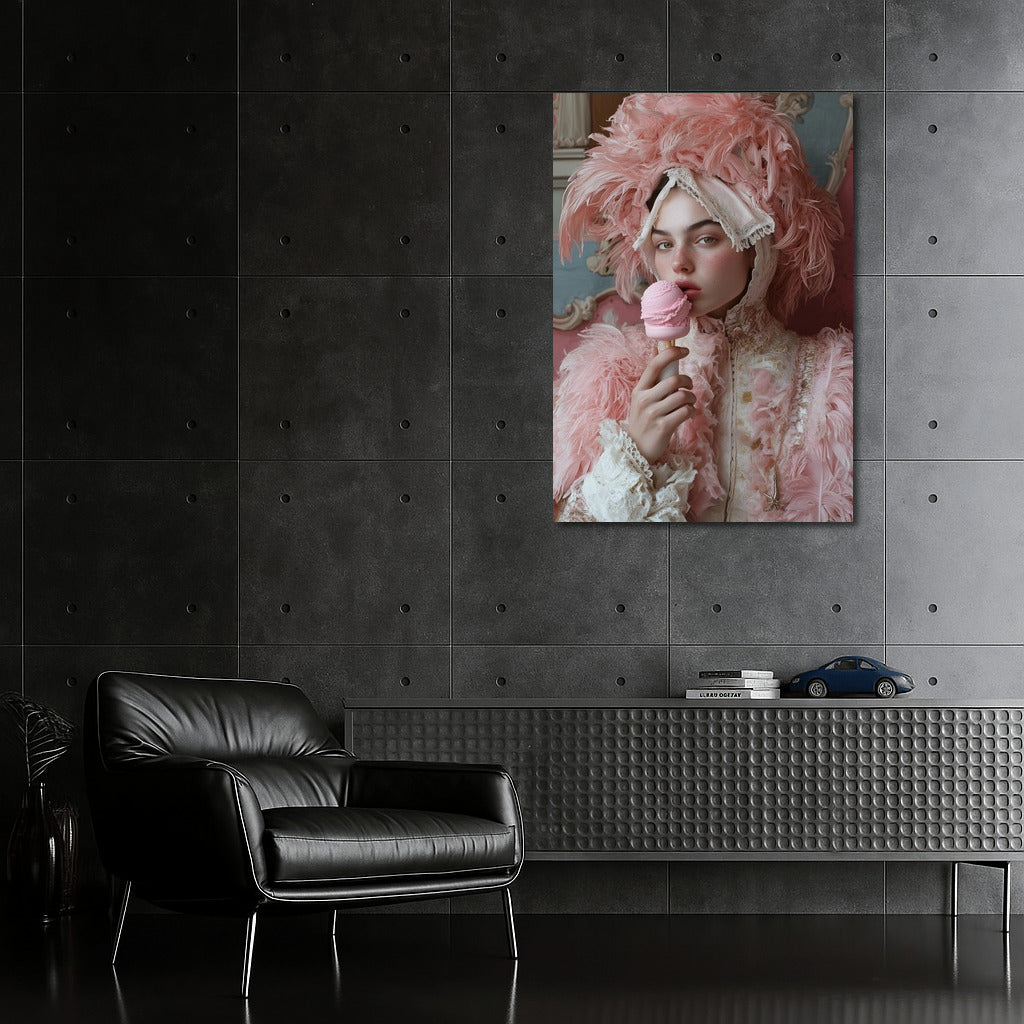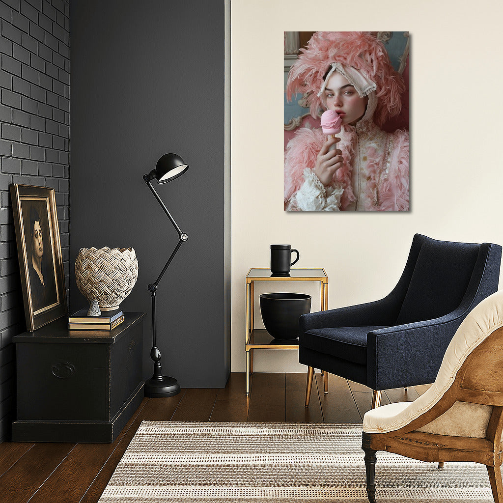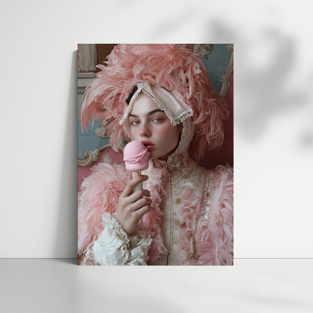 Elegant painting: a figure in luxurious feathers enjoys an ice cream. Add sophistication to your interior with this wall art! See more from the collection: Wall Art with Women
