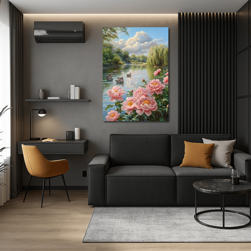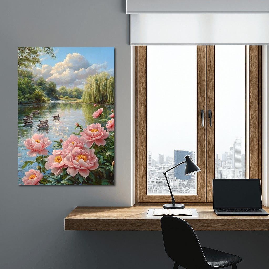Romance of nature: poster with pink peonies and a peaceful river. Perfect wall art to create a calm atmosphere. See more from the collection: Flowers Art