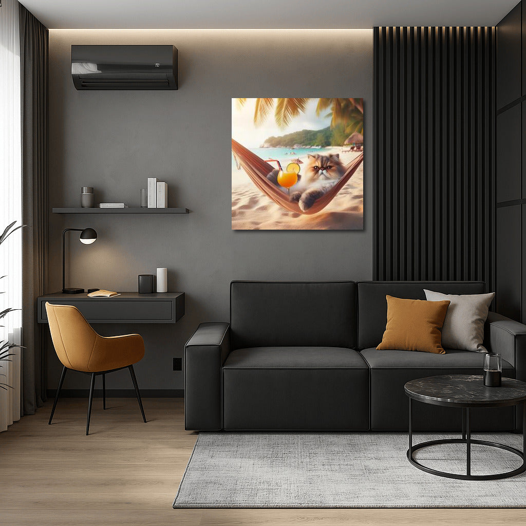A poster of a Persian cat relaxing in a hammock on the beach with a cocktail. Perfect wall art for those who love to relax! See more from the collection: Animals Art