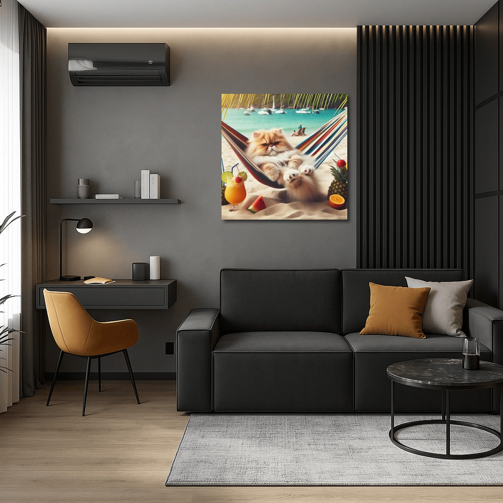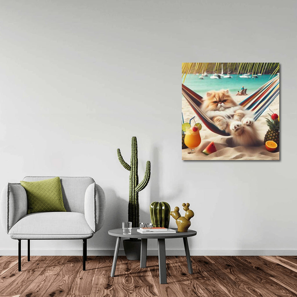 Wall art for dreamers: Persian cat enjoying a cocktail in a hammock on the beach. Summer vibes in every detail! See more from the collection: Animals Art