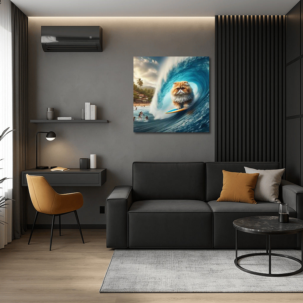 Poster of a Persian cat catching a giant wave. Wall art that adds a playful vibe to your interior! See more from the collection: Animals Art