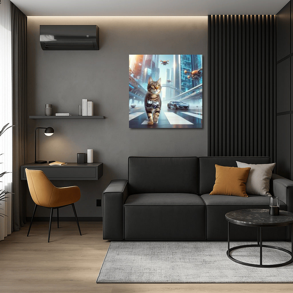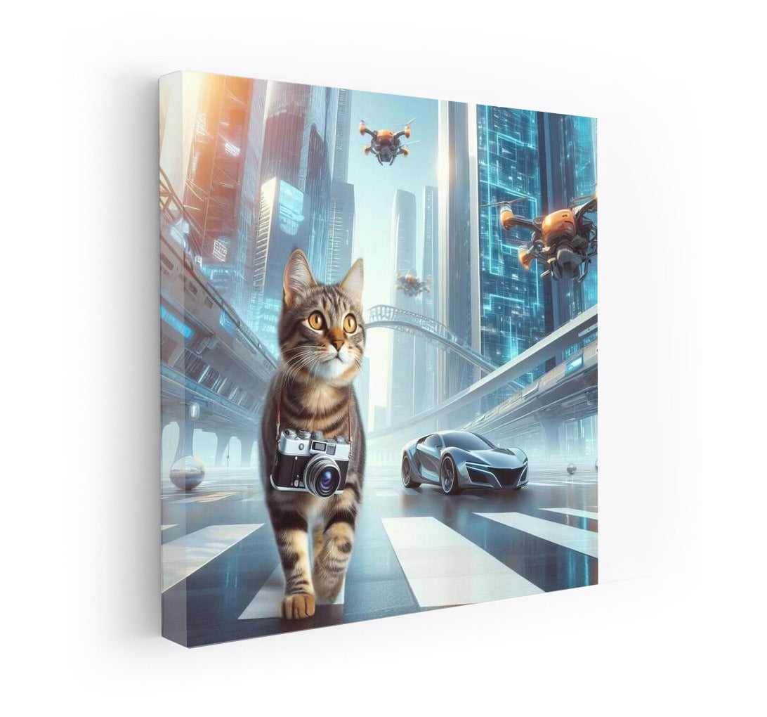 Futuristic cat photographer wanders among skyscrapers and drones, creating unique wall art. See more from the collection: Animals Art