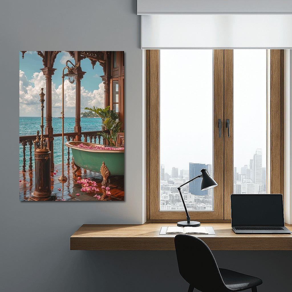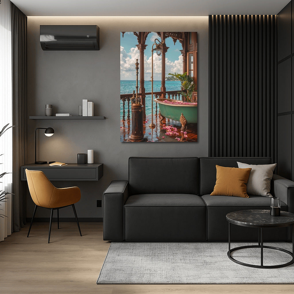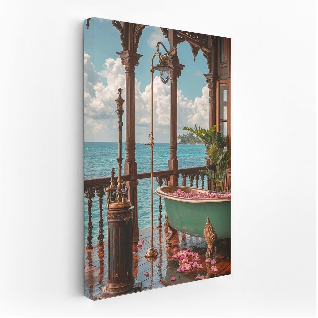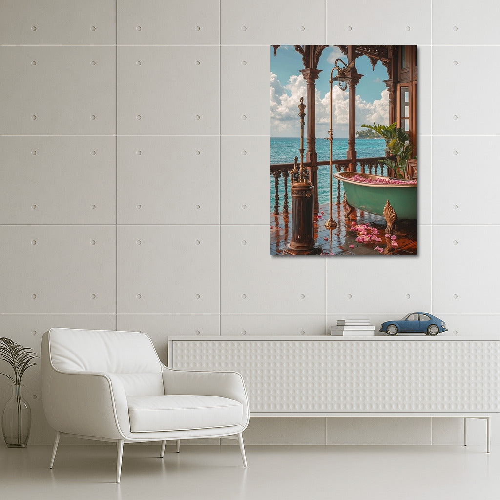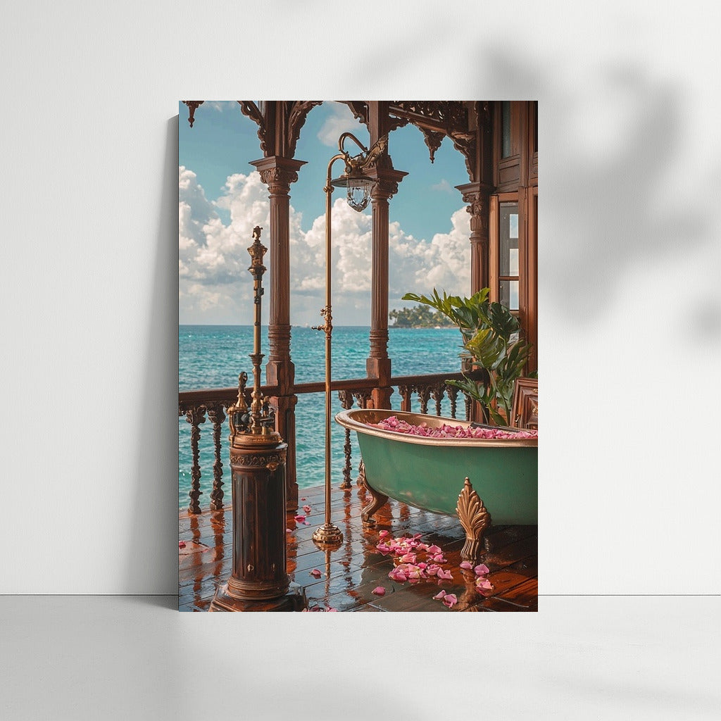 A poster of a relaxing bath by the sea, surrounded by rose petals and vintage architecture. Perfect wall art for a cozy space. See more from the collection: Architectural Art