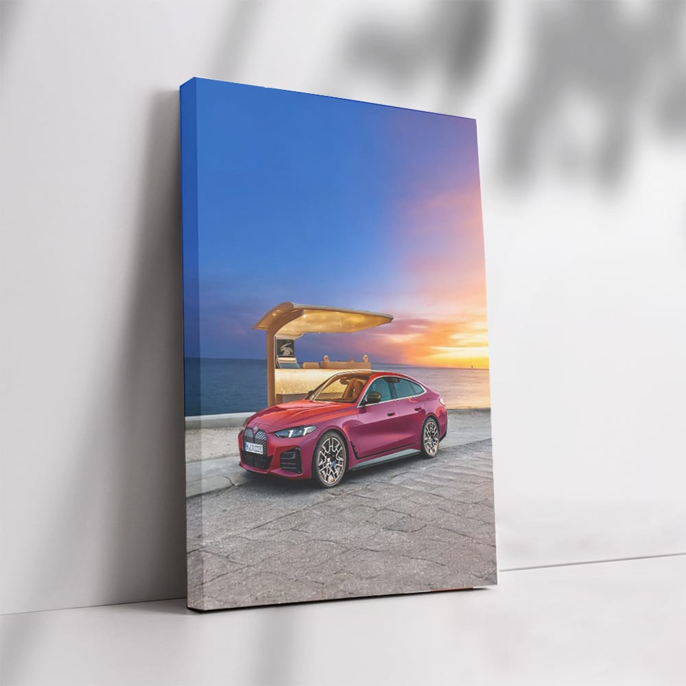 This poster is pure adrenaline for car lovers. The BMW i4 M50 in bold pink on the beach is a painting that simply screams speed and style. This wall art will be the perfect decoration for any garage or man cave. See more from the collection: BMW 4 Series Art