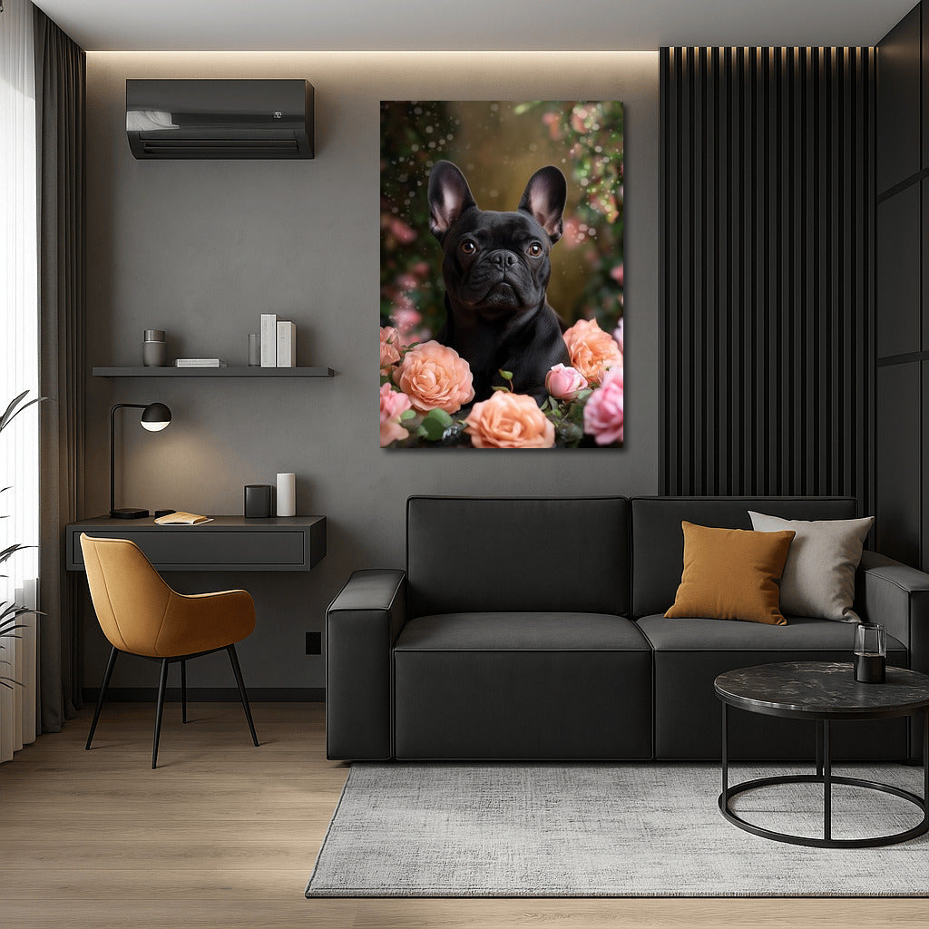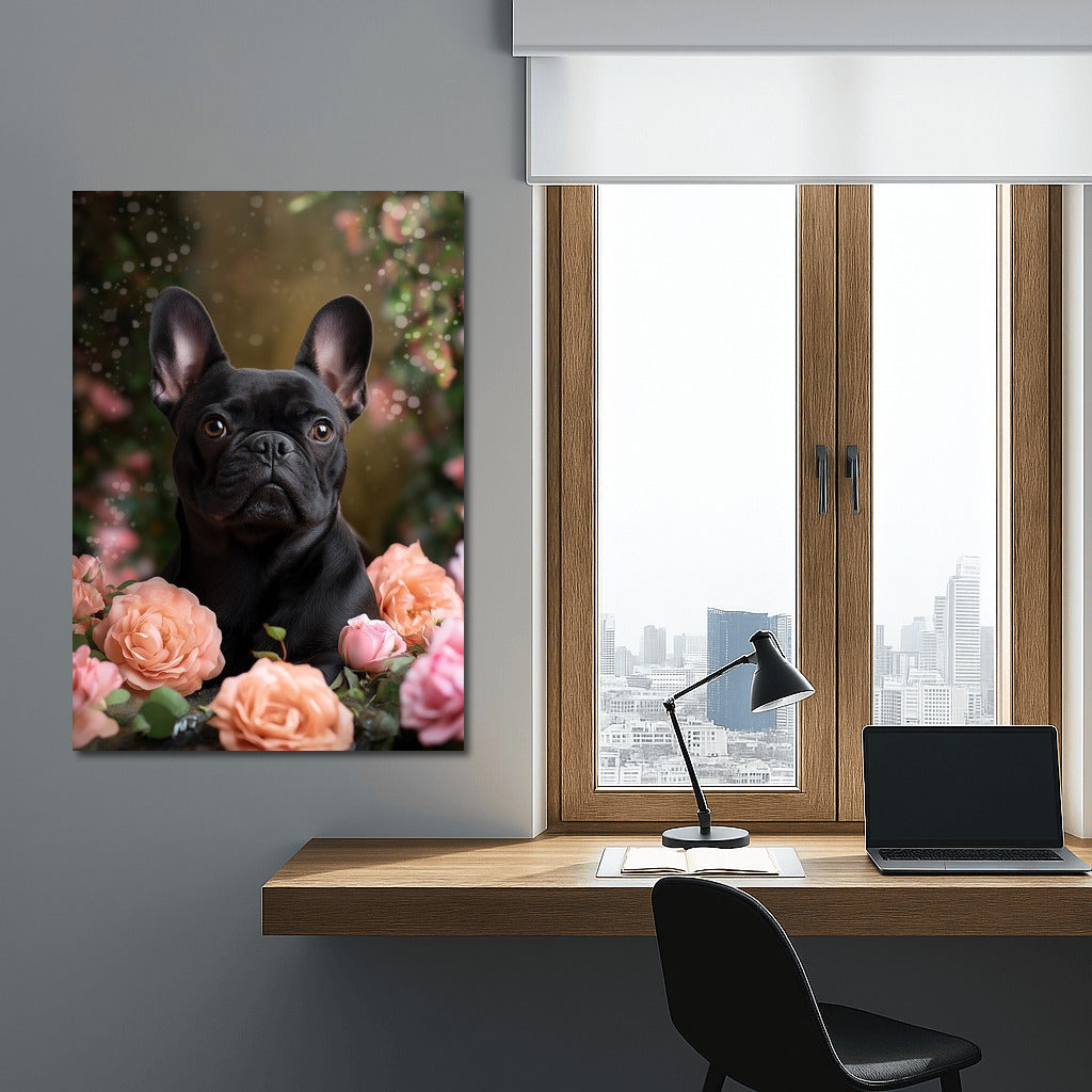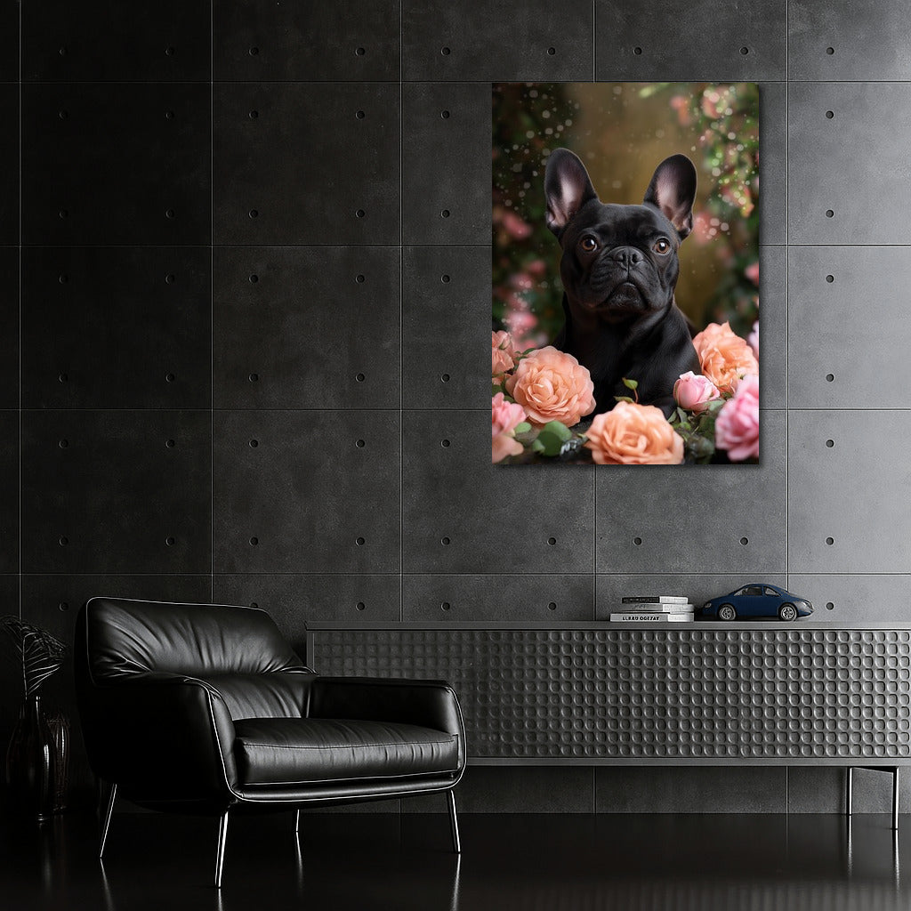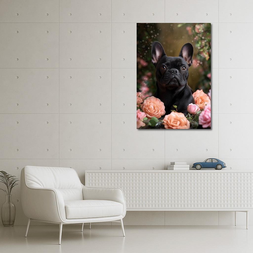 This adorable French Bulldog poster among roses is a vibrant wall art to add coziness and warmth to your home. See more from the collection: Animals Art
