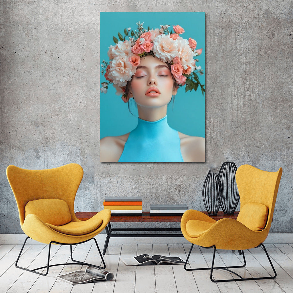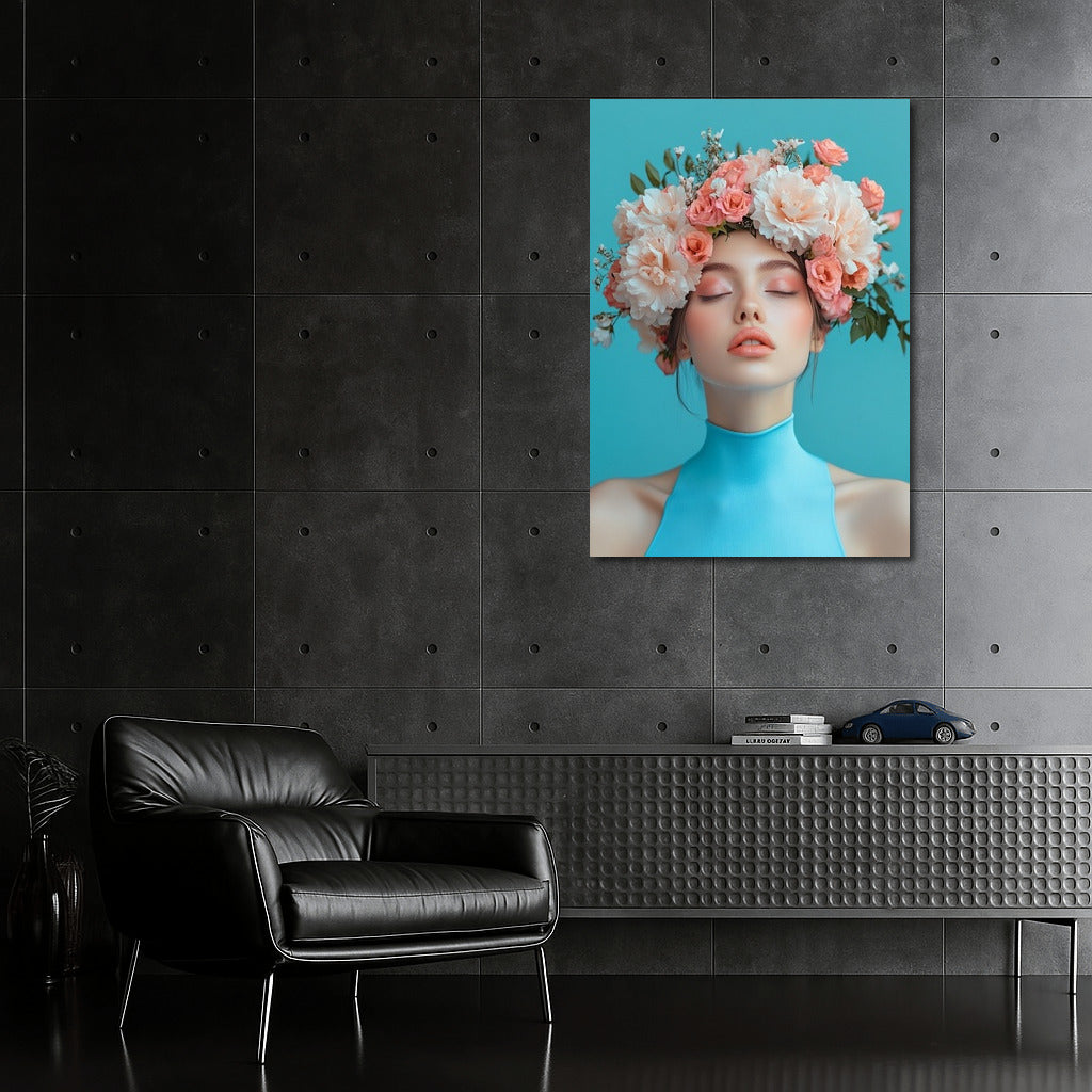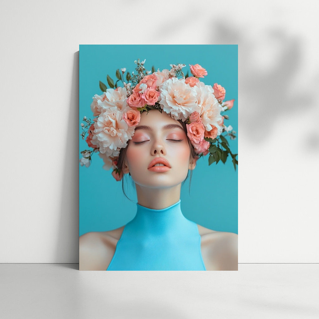Floral extravaganza on the poster: a girl with a wreath of roses and peonies. Modern wall art that enlivens any space. See more from the collection: Wall Art with Women
