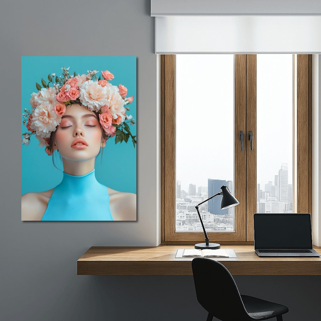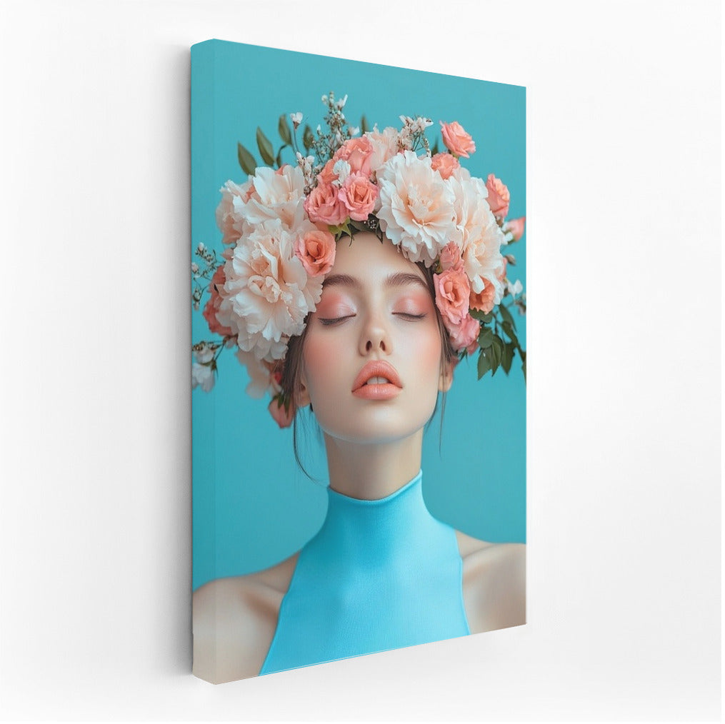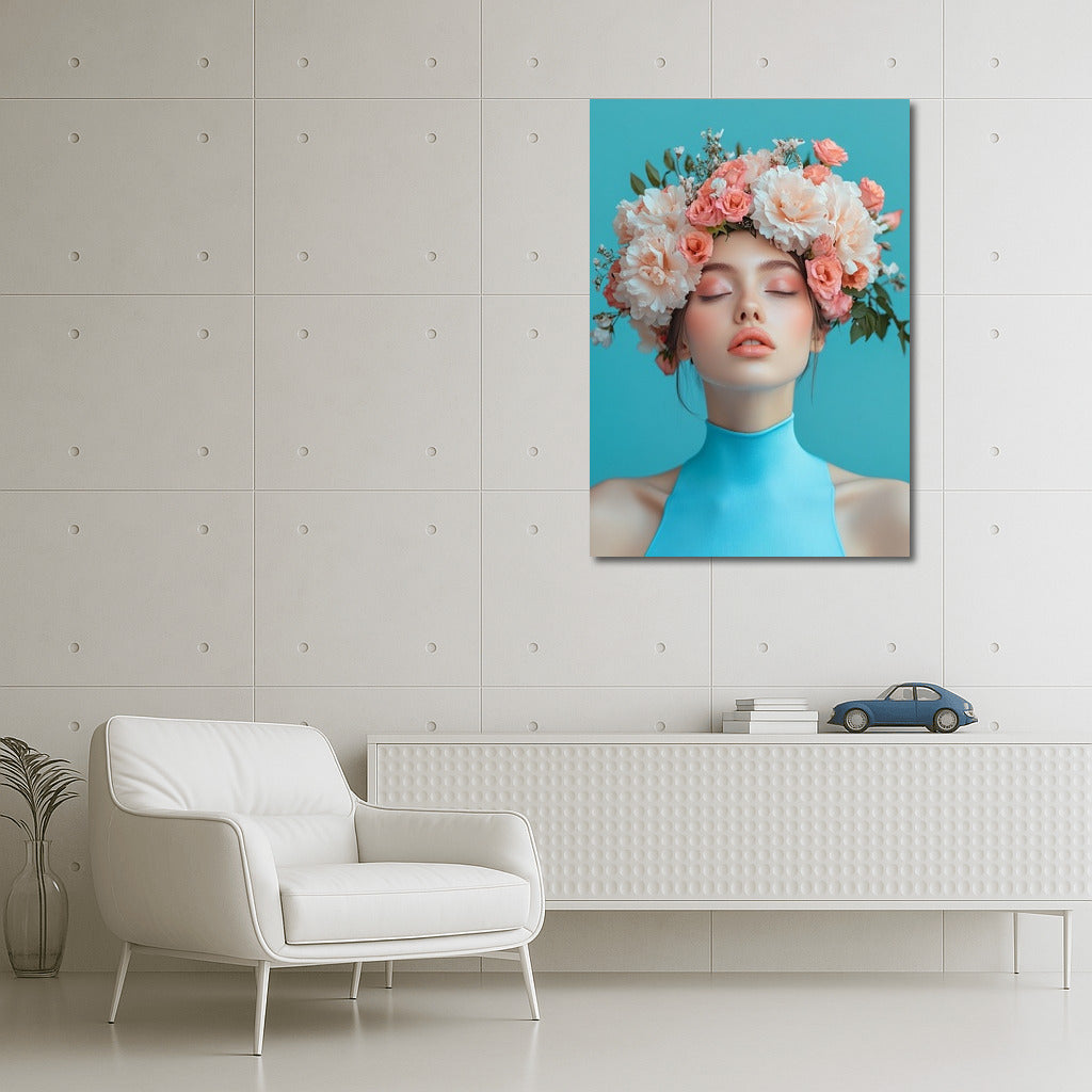 Floral extravaganza on the poster: a girl with a wreath of roses and peonies. Modern wall art that enlivens any space. See more from the collection: Wall Art with Women