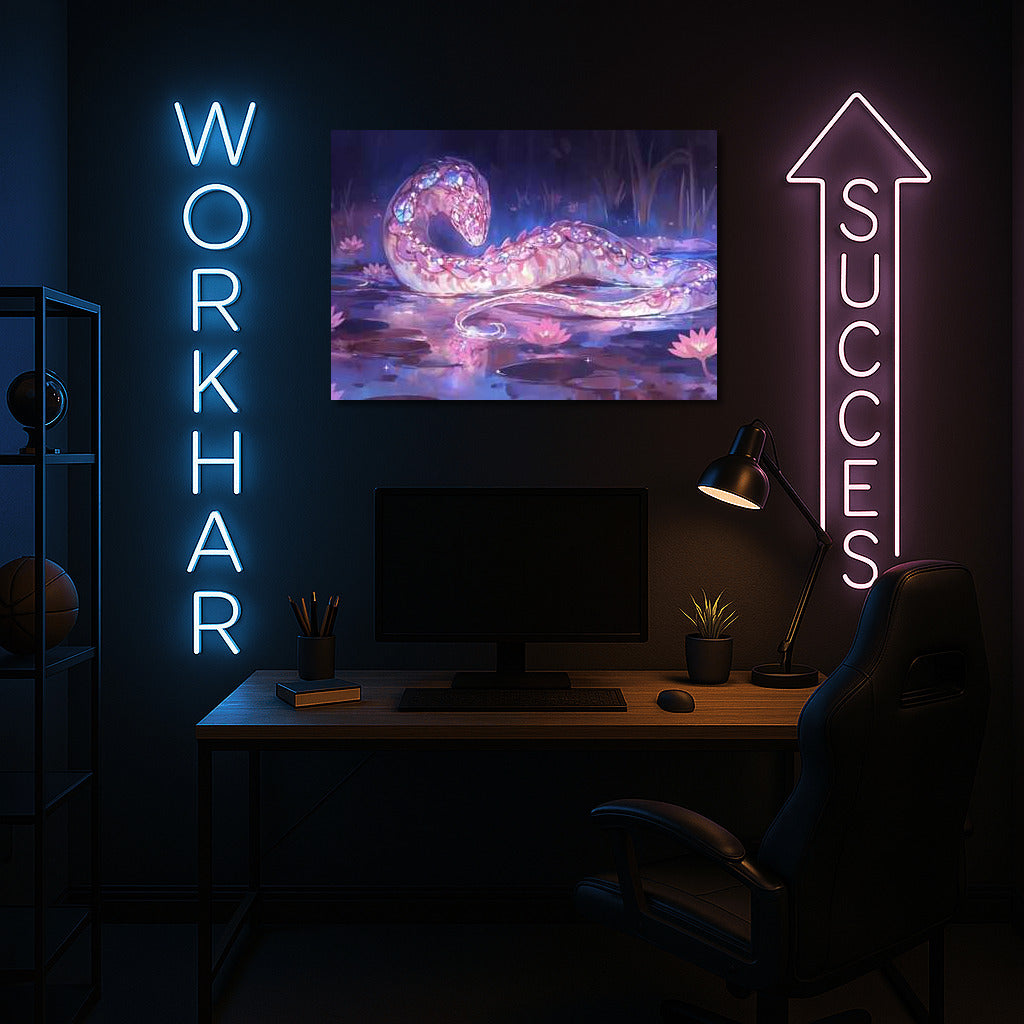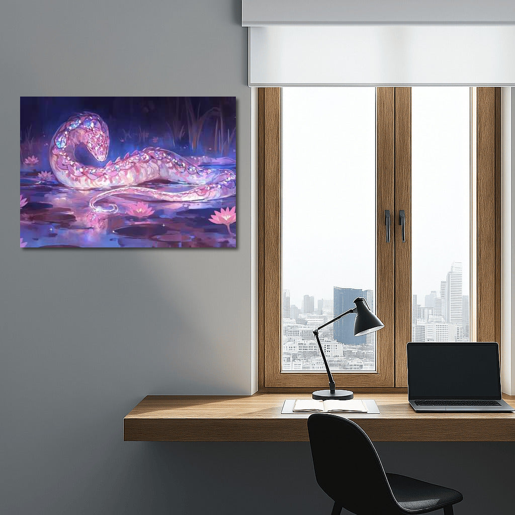 Dive into a fantasy world with this mesmerizing painting. The pink dragon comes to life in a magical water play of light! See more from the collection: Fantasy Art