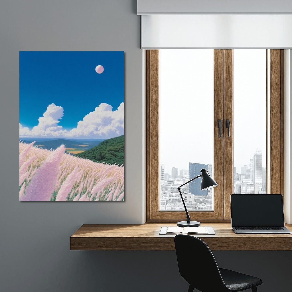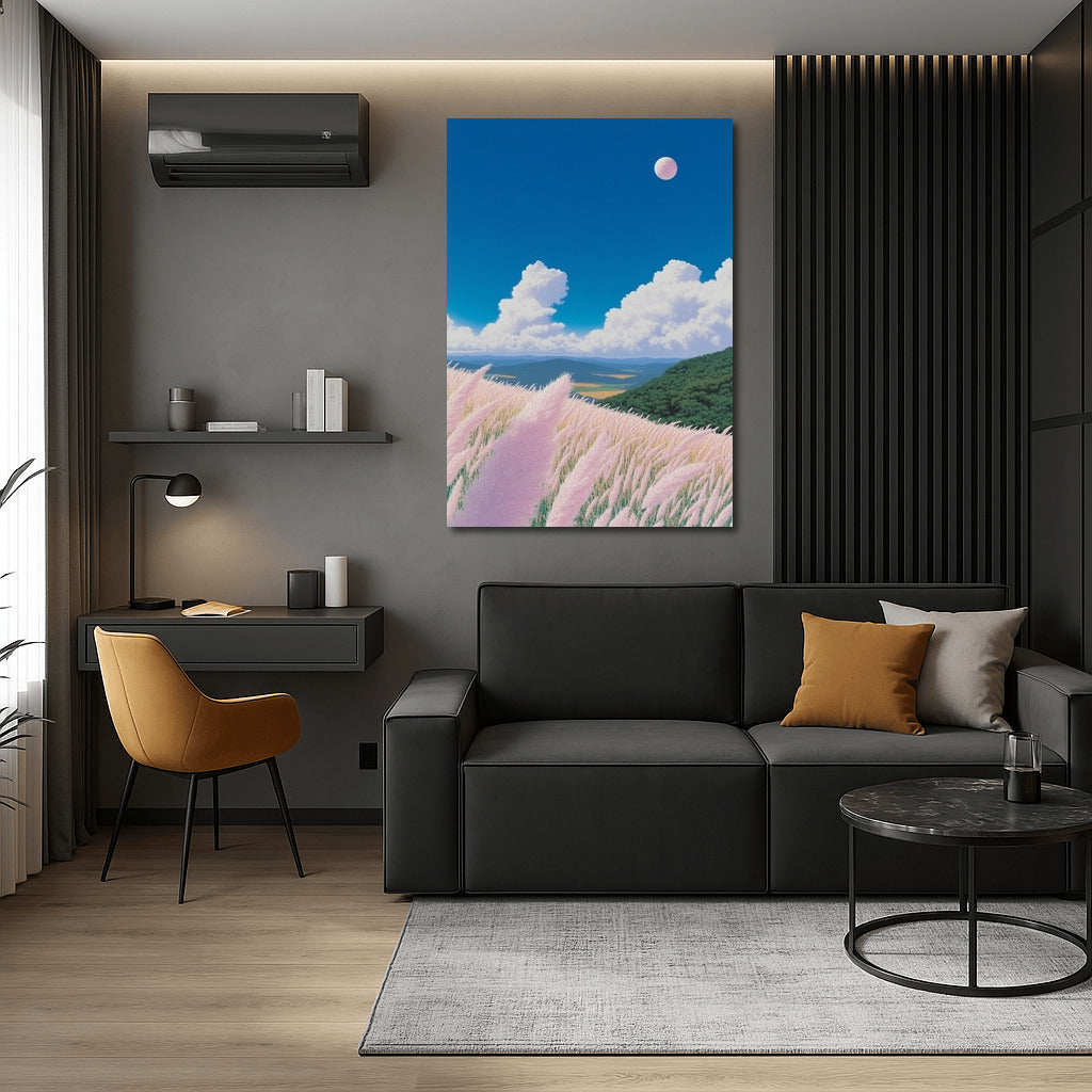 Gentle nature poster: pink fields under bright sky. This wall art is for those who seek solitude and tranquility. See more from the collection: Mixed Wall Art