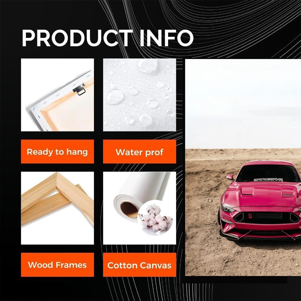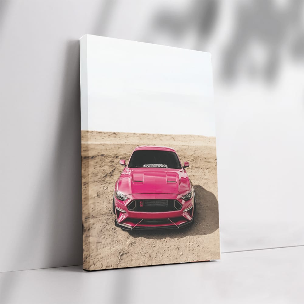 What a poster! A bright pink Mustang speeding down mountain roads. The painting screams, "Get on the gas!" This is wall art for those who appreciate speed and style. Bold, just like the Mustang itself. See more from the collection: Ford Art