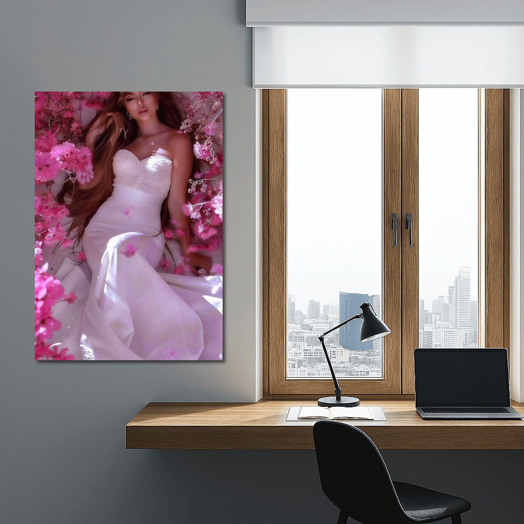 An elegant painting of a girl in a cloud of pink flowers. Wall art that creates an atmosphere of tenderness and dreams. See more from the collection: Wall Art with Women