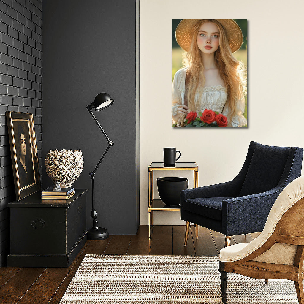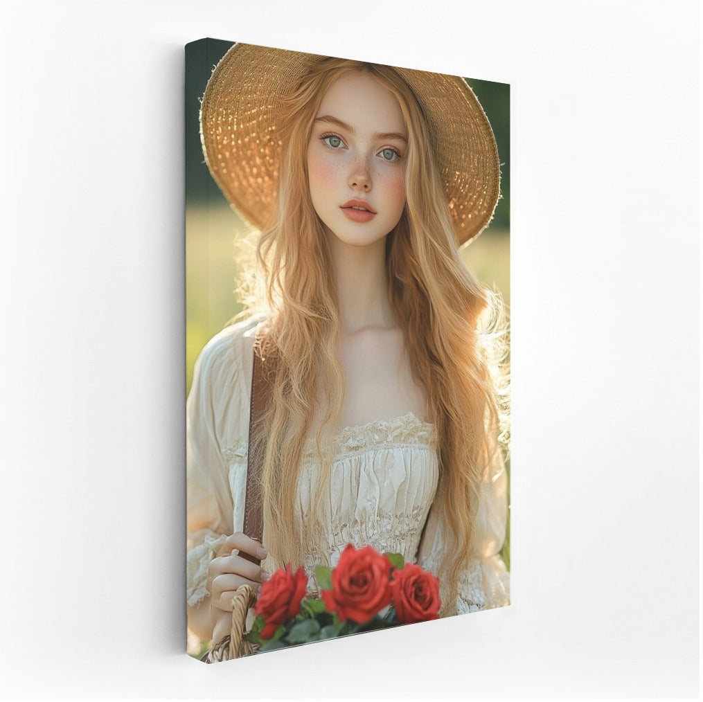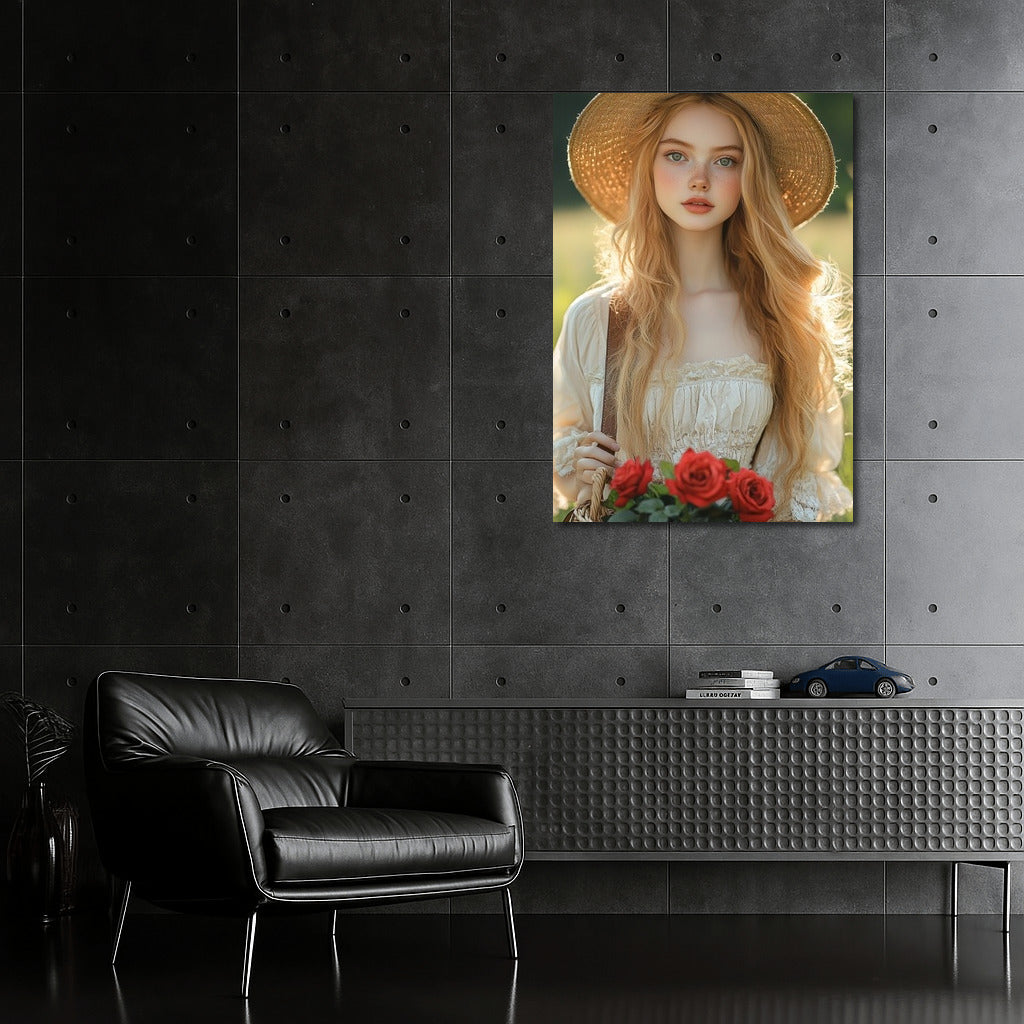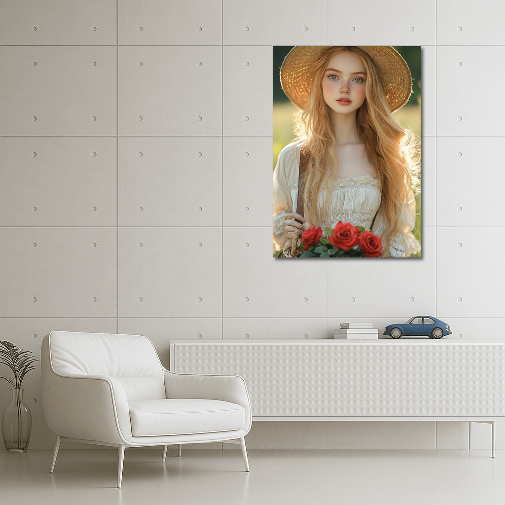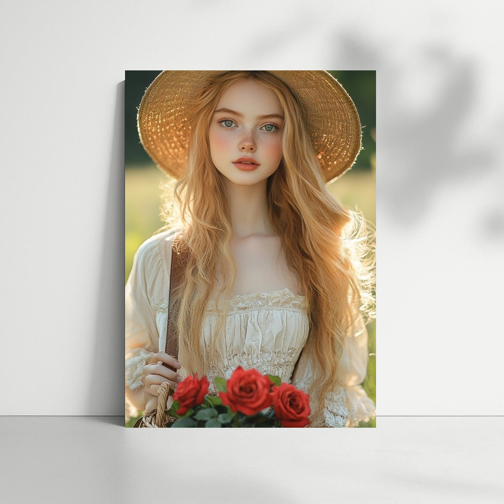 Summer poster: girl in a hat with a basket of bright roses. Inspiration and tenderness for your wall art. See more from the collection: Wall Art with Women