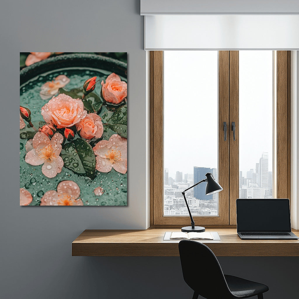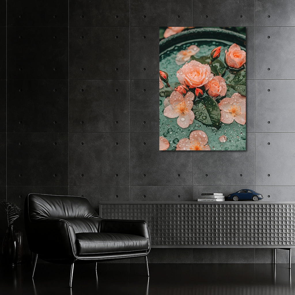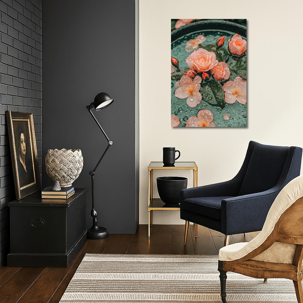Immerse yourself in a world of tranquility with this painting: delicate roses on water will become an exquisite accent of your wall art. See more from the collection: Pink Flowers Art