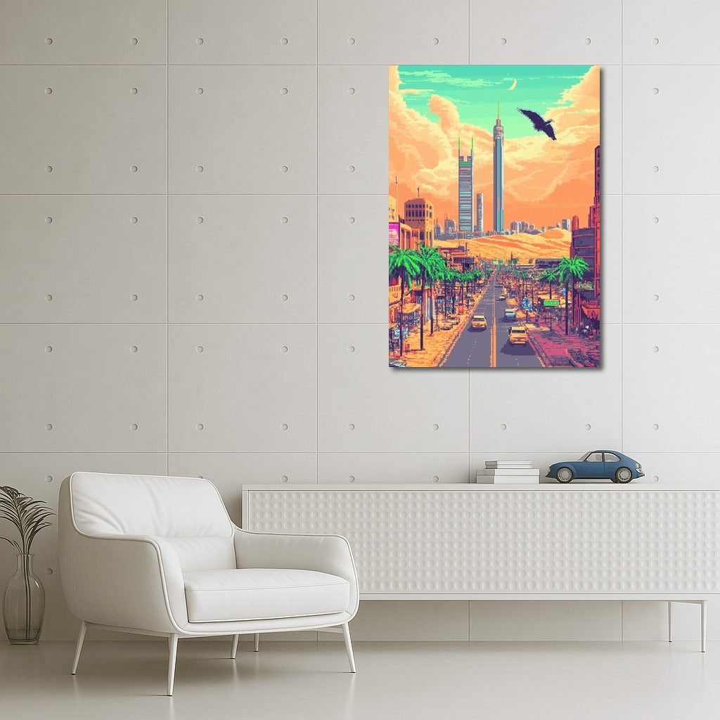 Cityscapes in vibrant pixel art: wall art where skyscrapers and palm trees come to life in a dream poster. See more from the collection: Cityscapes & Skylines Art