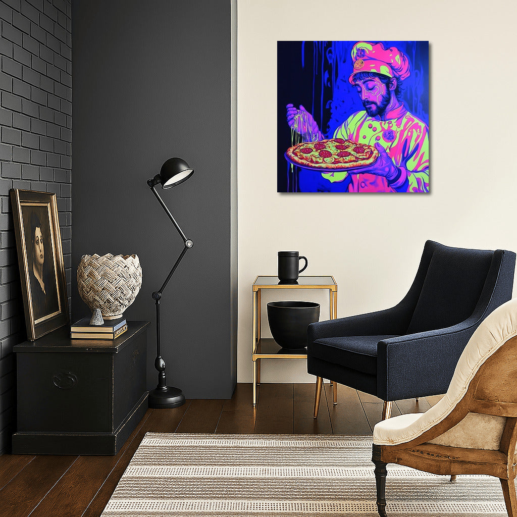 Psychedelic poster of a chef creating a pizza from a dream. Wall art for lovers of bright, unusual images! See more from the collection: Food Art