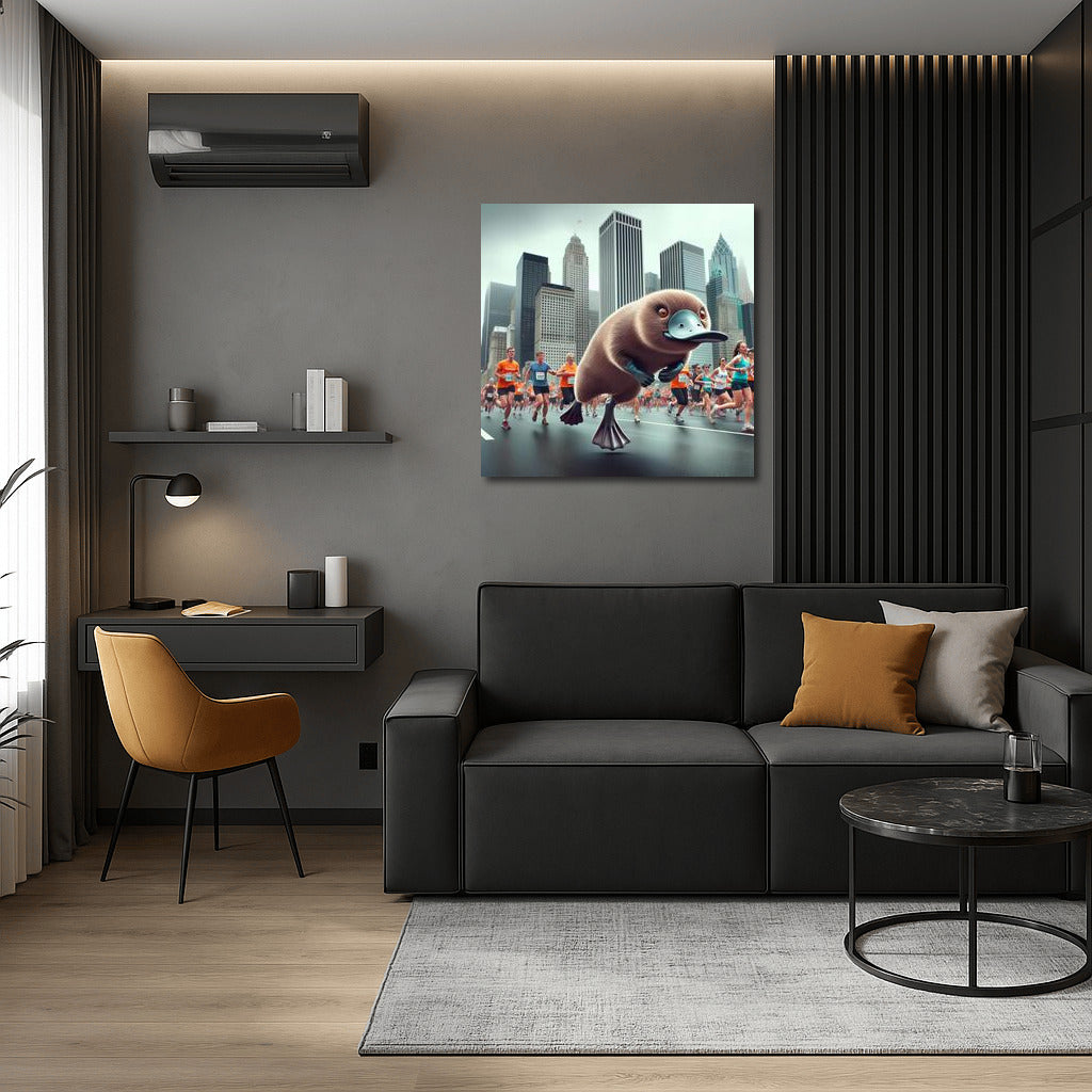 Amazing platypus runs a marathon among skyscrapers! Bright wall art will add dynamics to your interior. See more from the collection: Animals Art