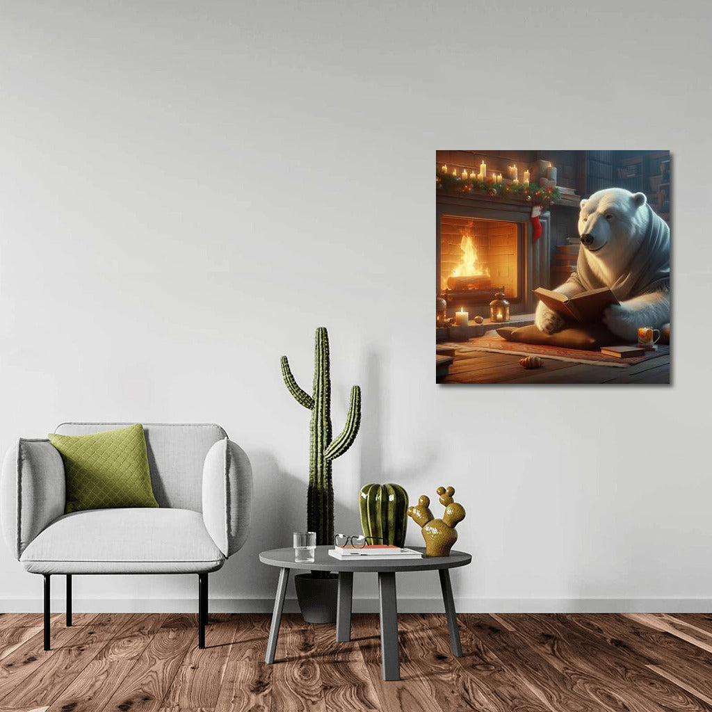 Polar Bear with a Book by the Fireplace: Comfort and Magic in the Interior Wall Art