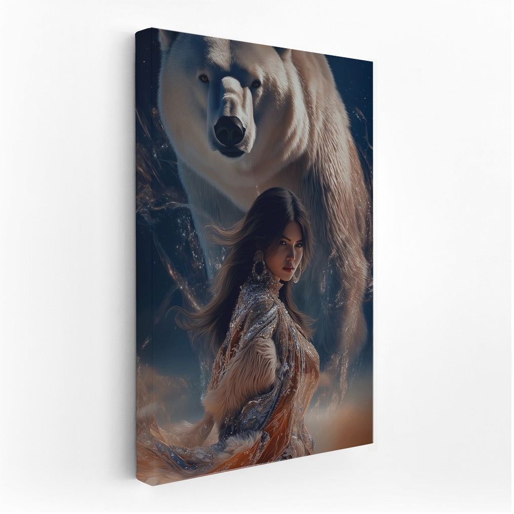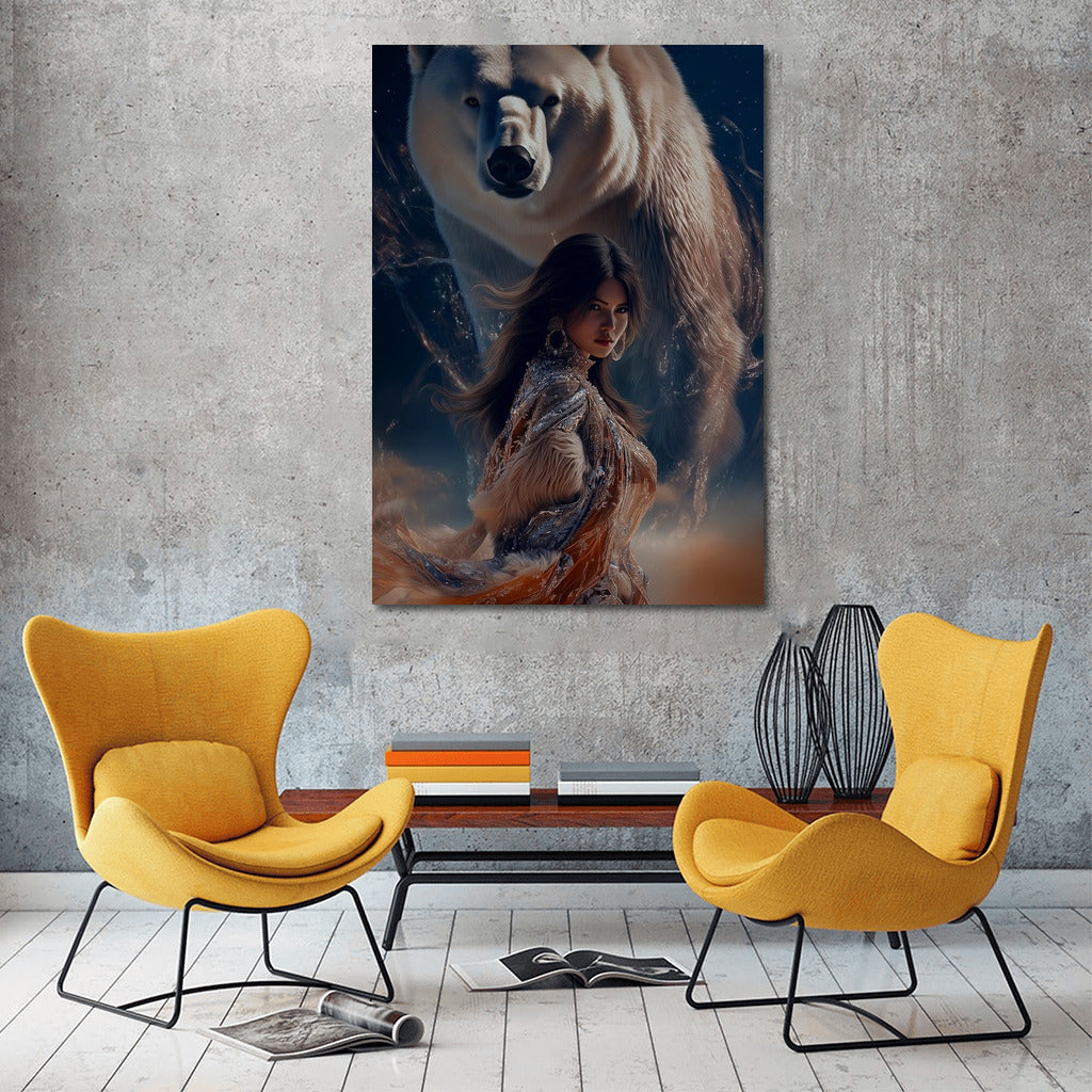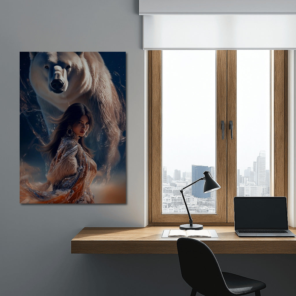 Magic of meeting: girl and polar bear in the dance of the night. This poster inspires and will add mystery to your home. See more from the collection: Mixed Wall Art