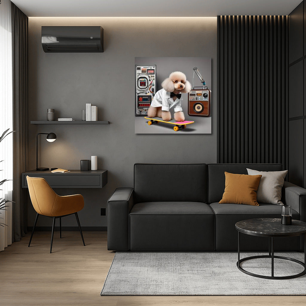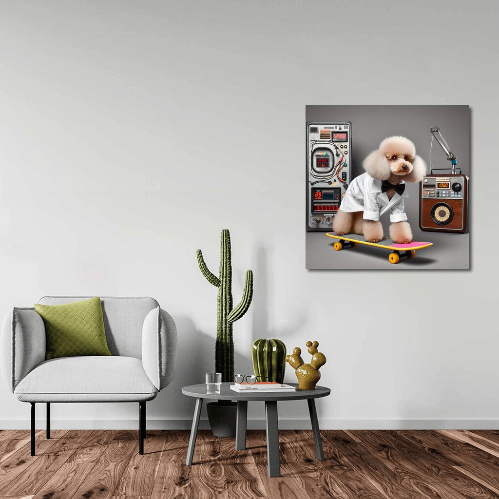 Stylish poodle on a skateboard in the spirit of Back to the Future. Perfect wall art for fans of the iconic atmosphere! See more from the collection: Animals Art
