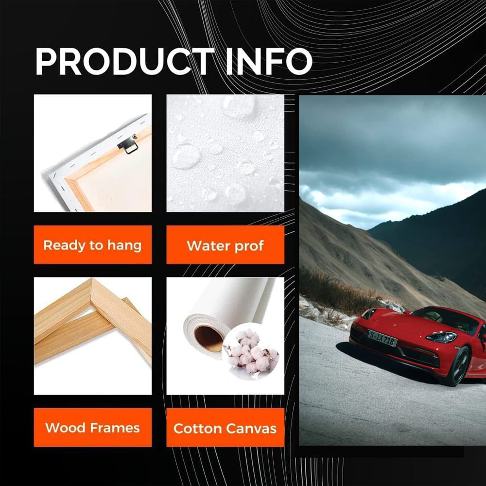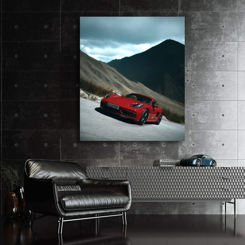 Imagine: a red Porsche Cayman 718 GTS, standing against the backdrop of majestic mountains. This poster is a real must-have for every car enthusiast! The painting breathes speed and power, and wall art in this style is not just decor, but a challenge to the world! See more from the collection: Porsche Art