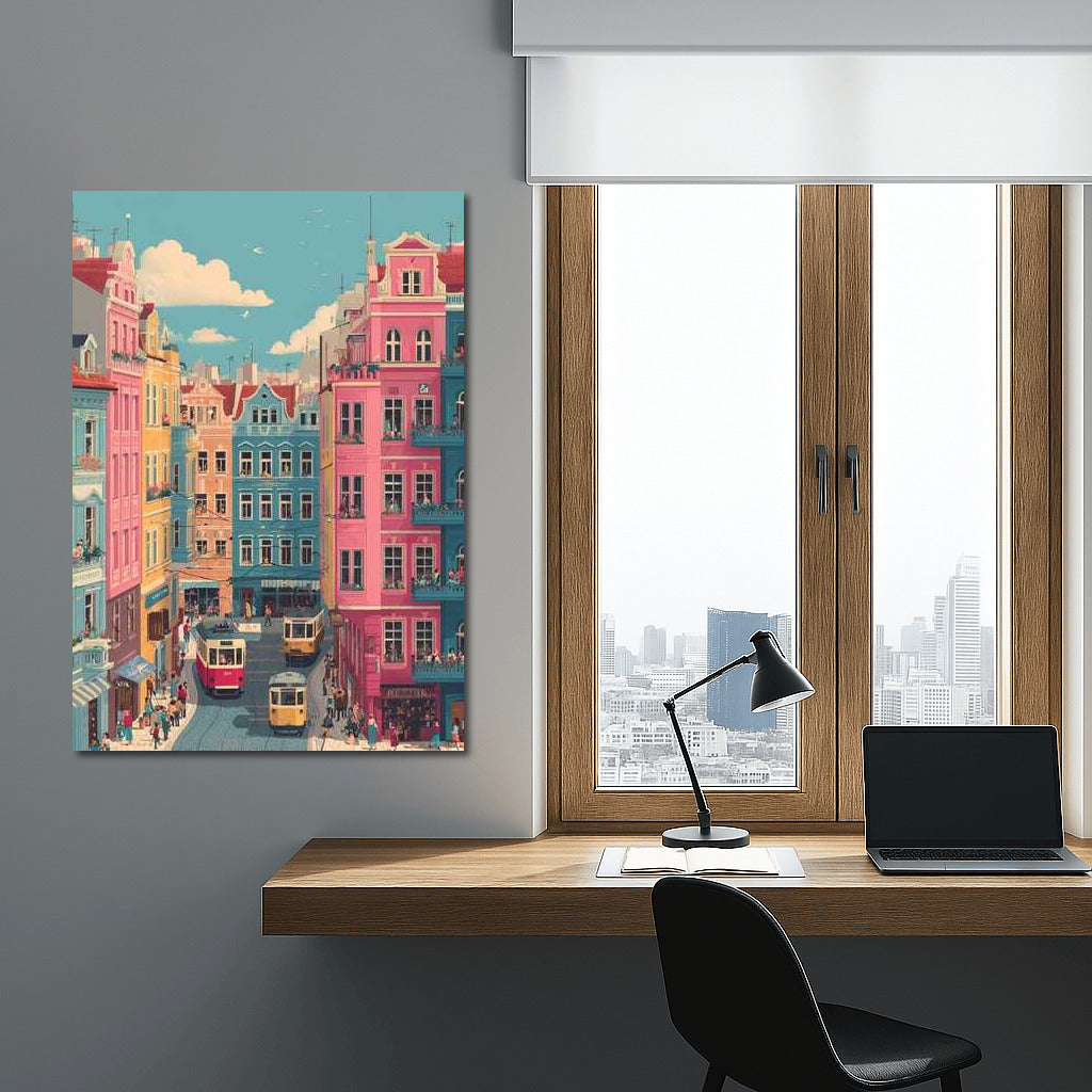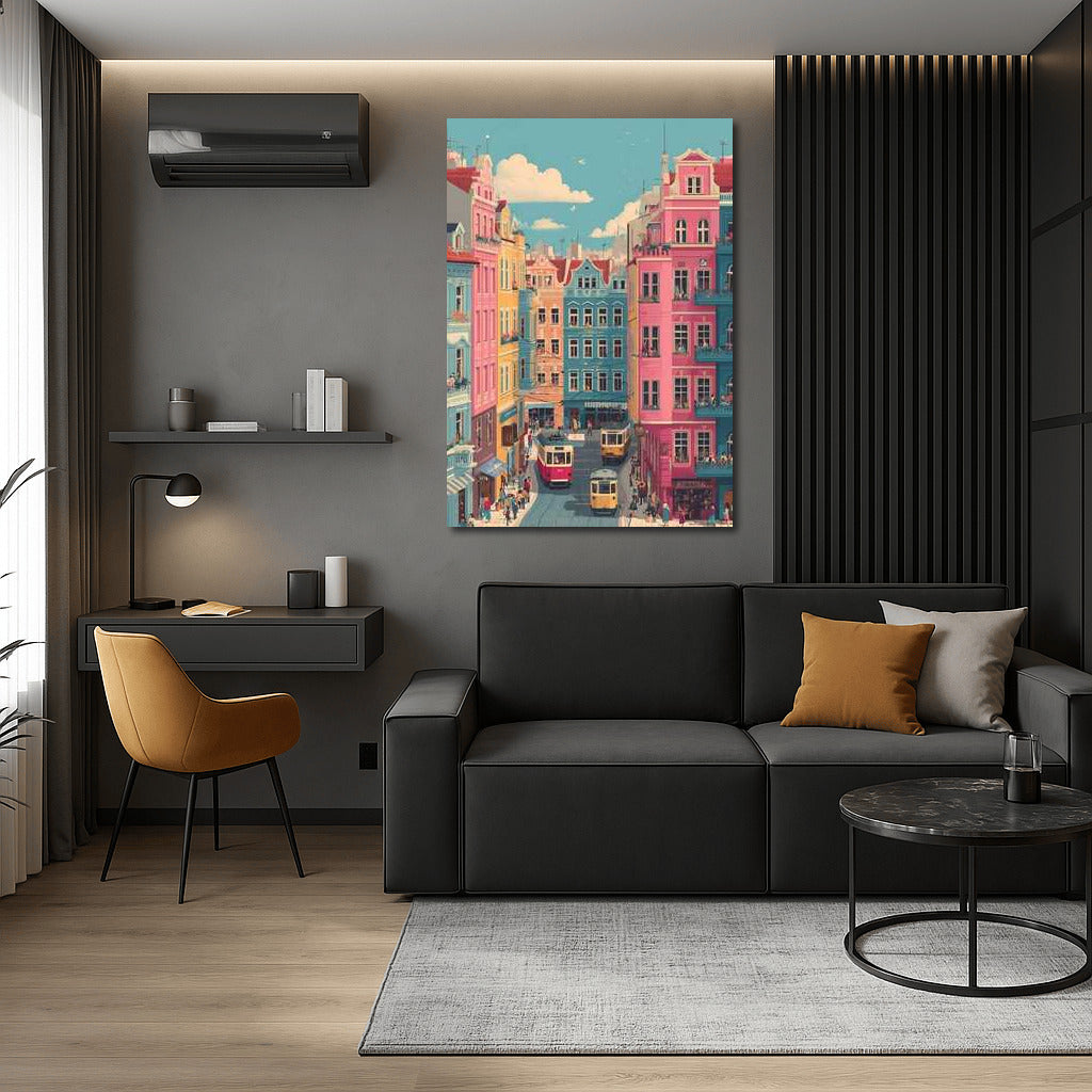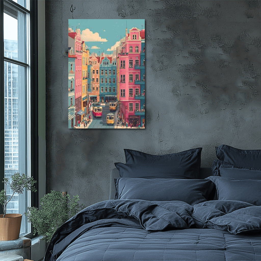 Bright colours of an urban fairy tale: the Prague poster enlivens your interior with the atmosphere of Czech streets and historic trams. See more from the collection: Cityscapes & Skylines Art