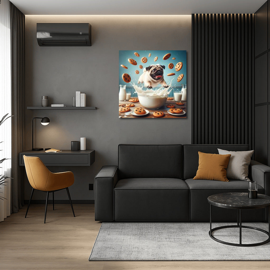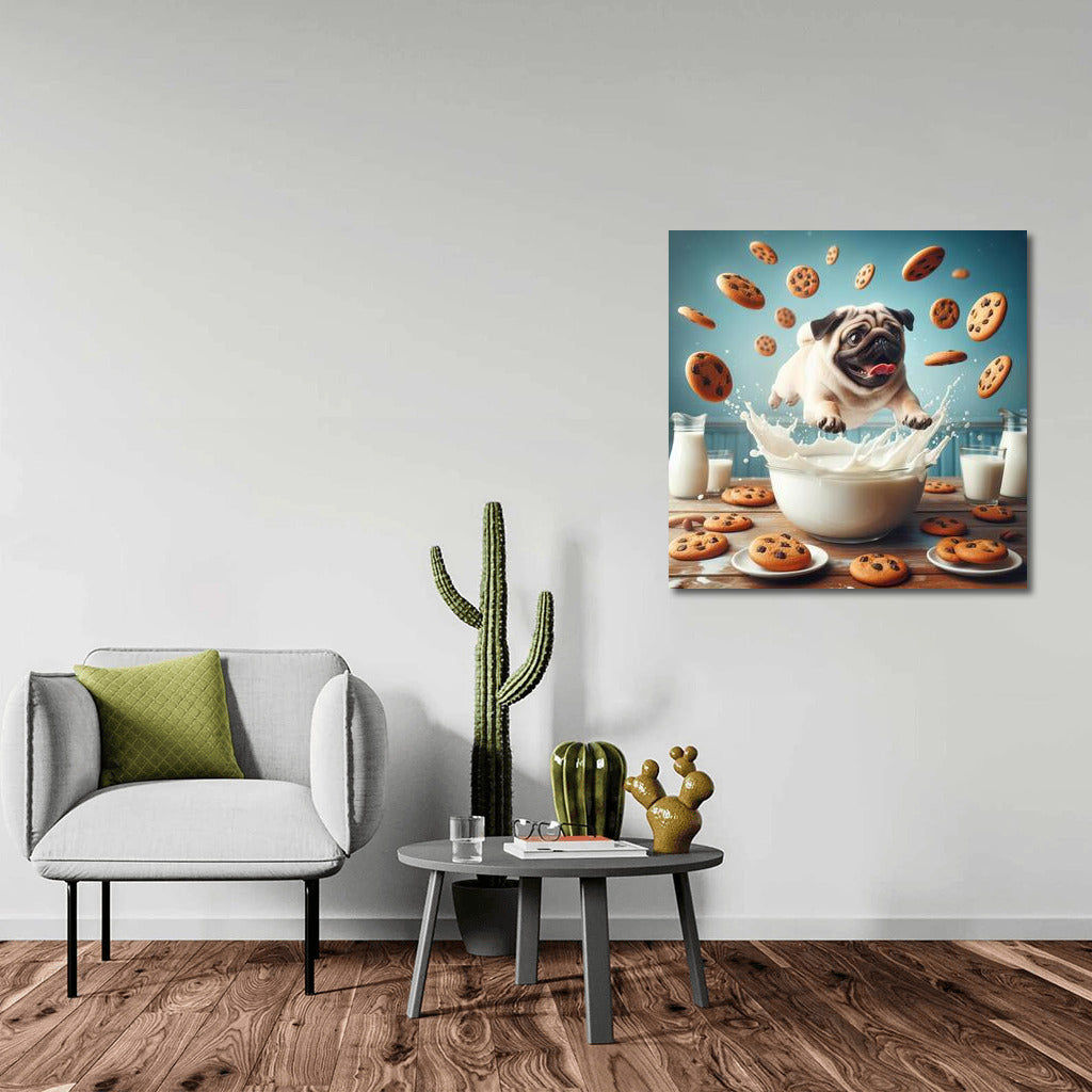 Pug in a Milk Pool with Flying Cookies Wall Art