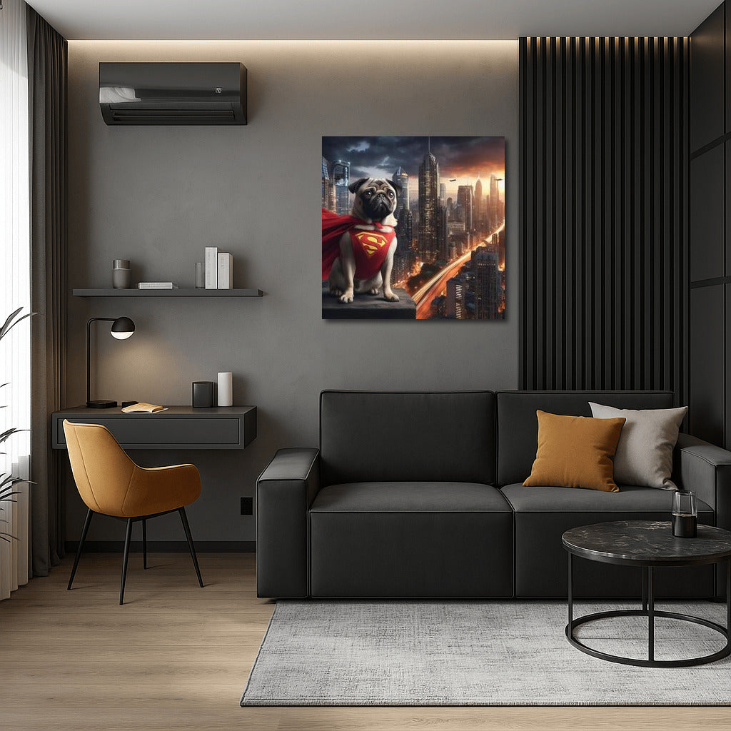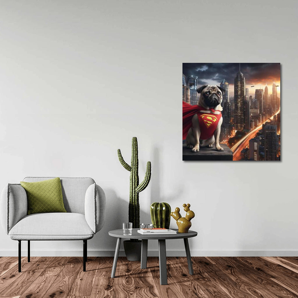 Pug Superhero in the City of the Future: Savior of the 21st Century Wall Art
