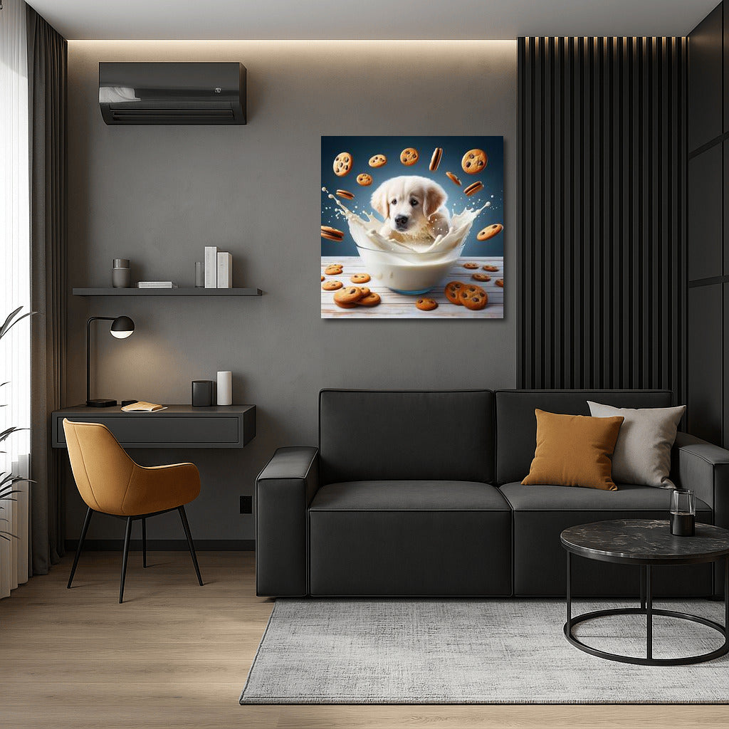 A puppy dives into a sea of milk, with cookies swirling around. Art that fills your home with taste and joy! See more from the collection: Animals Art