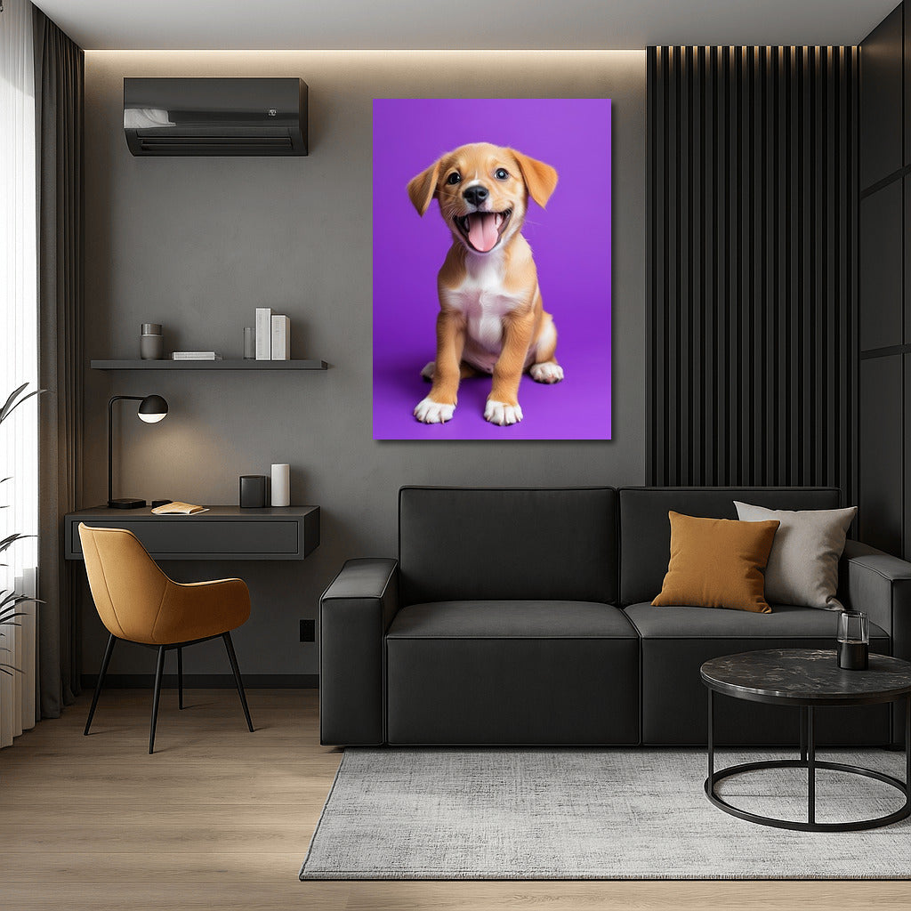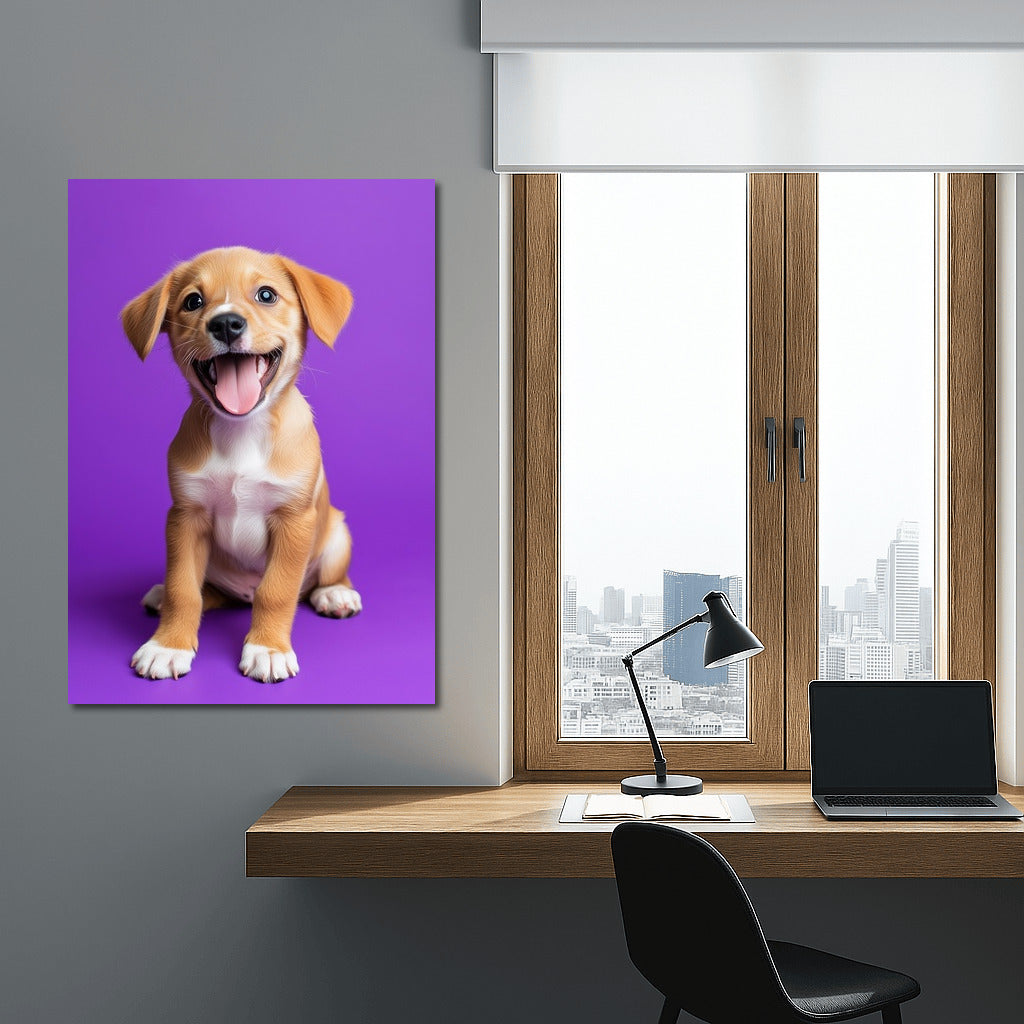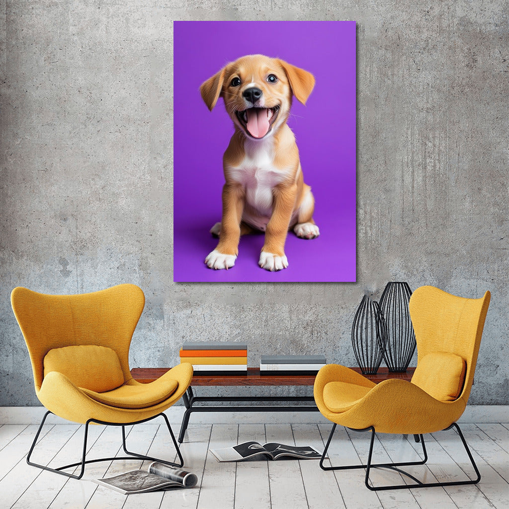Adorable puppy on a bright background: a poster filled with joy and color that will liven up any space. Wall art for the soul! See more from the collection: Animals Art