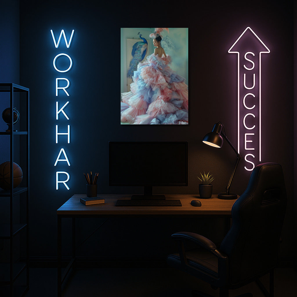 A poster of an elegant queen in a chic outfit, surrounded by the magic of peacocks. Turn your wall into a royal masterpiece! See more from the collection: Wall Art with Women