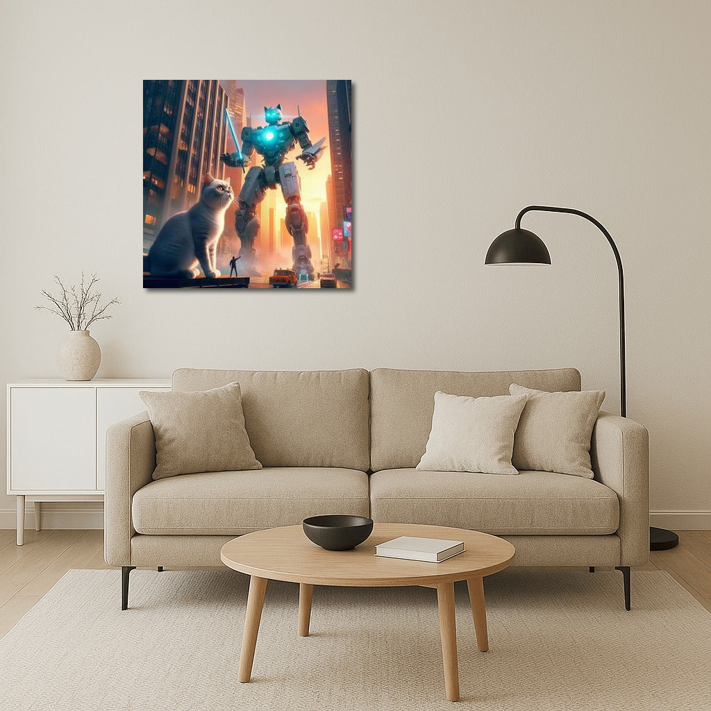 Epic Poster: Ragdoll Cat Controls Giant Robot, Protecting City From Alien Invasion. Wall Art Of The Future! See more from the collection: Animals Art