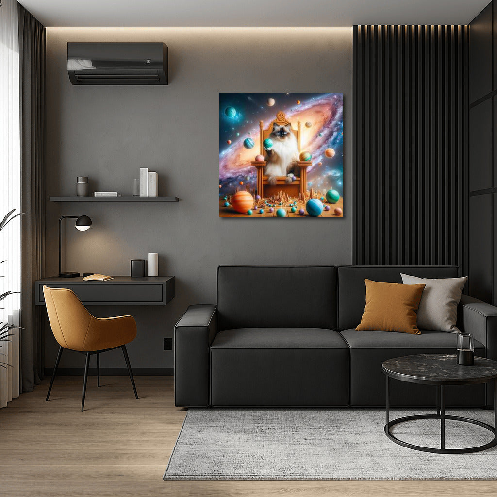 King of the Universe poster: Ragdoll on the throne in the galaxy playing with planets. Fantasy wall art for dreamers. See more from the collection: Animals Art